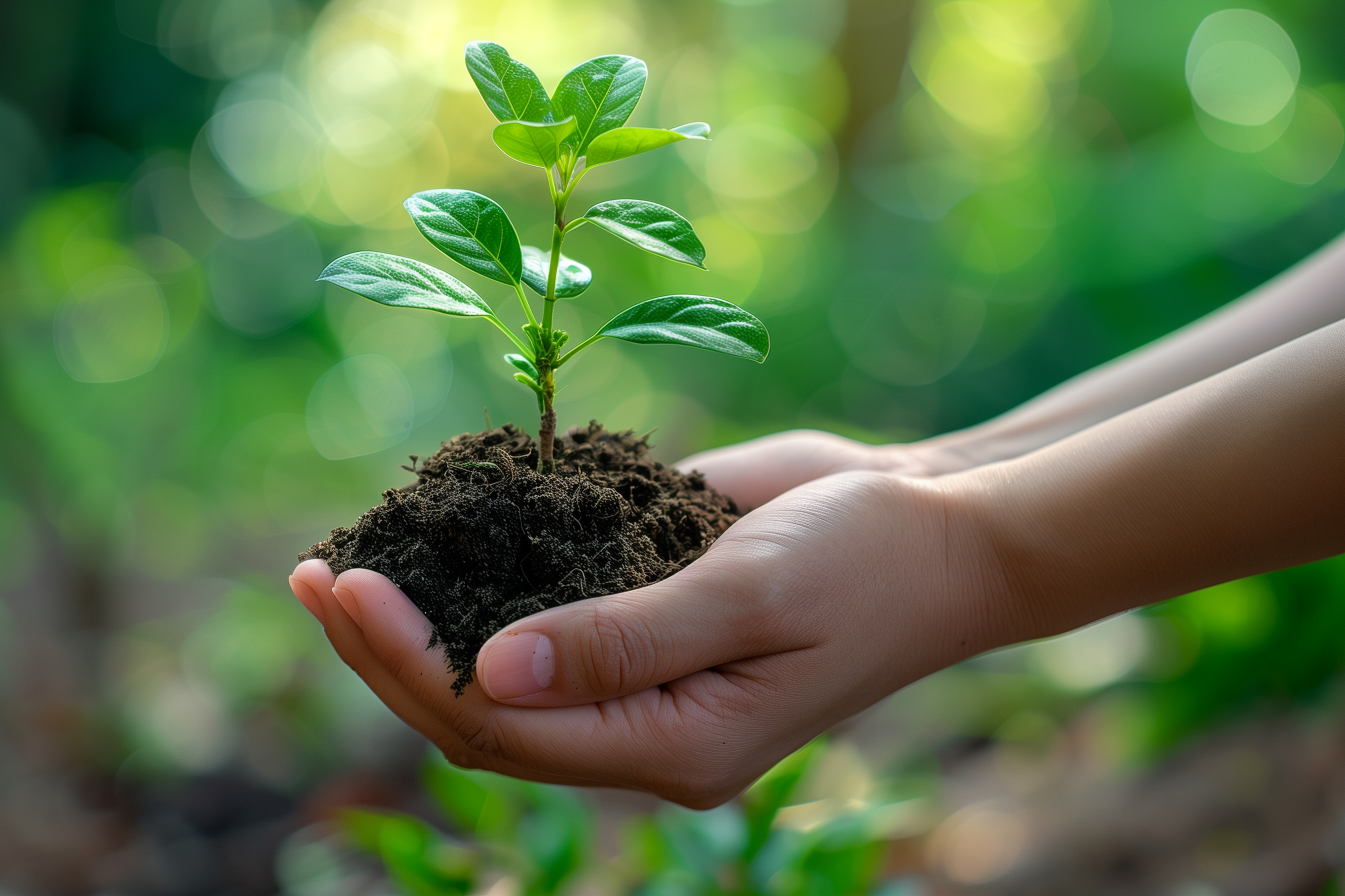 Das Bild zeigt eine kleine grüne Pflanze, die in den Händen einer Person gehalten wird. Die Pflanze wächst aus einem Boden mit dunkler, nährstoffreicher Erde heraus. Die Komposition zentriert sich auf den Kontrast zwischen den zarten Blättern und den umschließenden Händen, die die Verantwortung und Fürsorge für die Natur symbolisieren. Die natürliche, verschwommene Umgebung mit verwischten, grünen Hintergründen verleiht dem Bild eine friedvolle und meditative Stimmung.