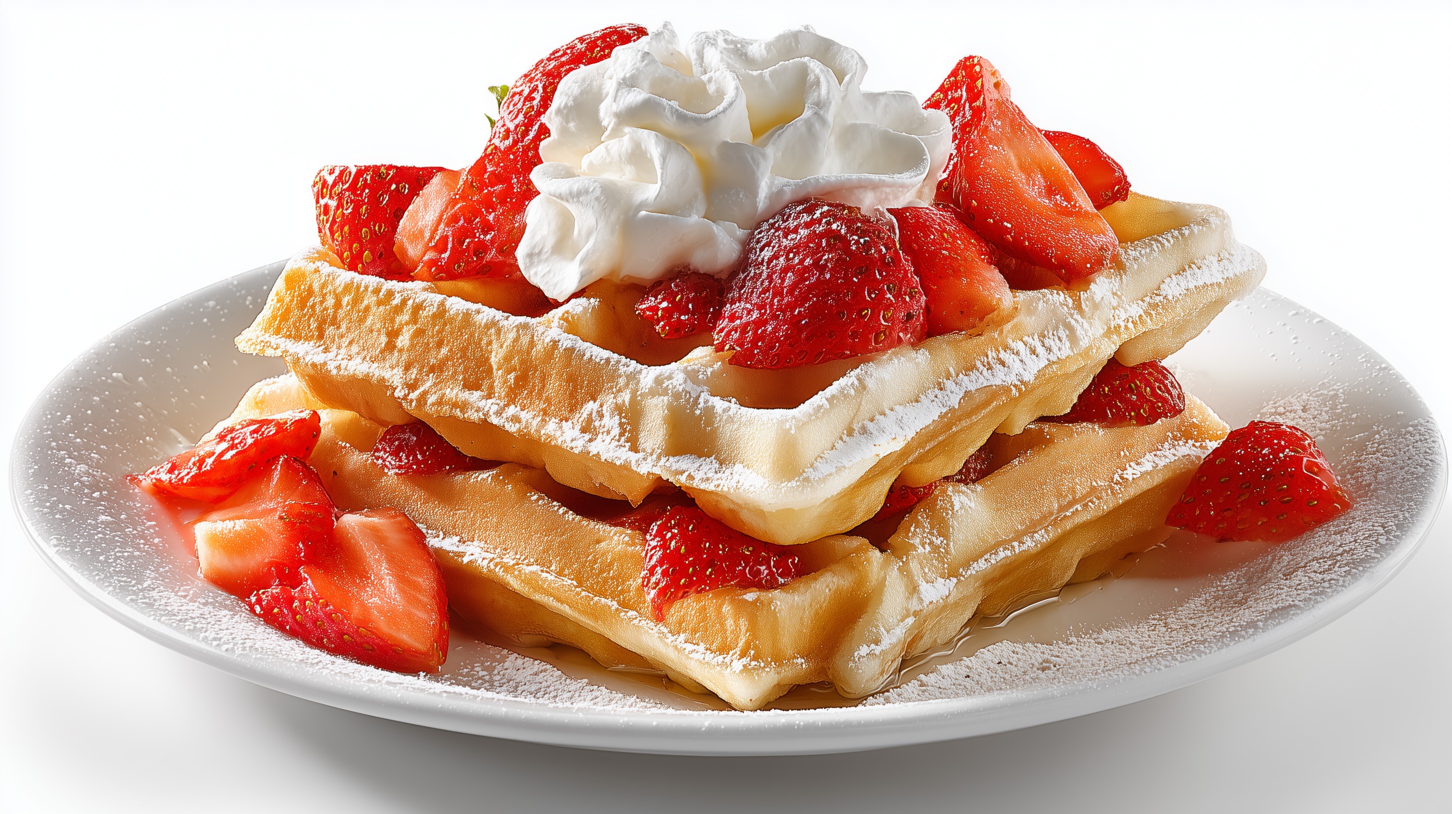 - Je zwei Waffeln auf einem Teller anrichten, großzügig mit den marinierten Erdbeeren belegen, einen Klecks Schlagsahne darauf setzen und nach Belieben mit Puderzucker bestäuben. Sofort servieren.