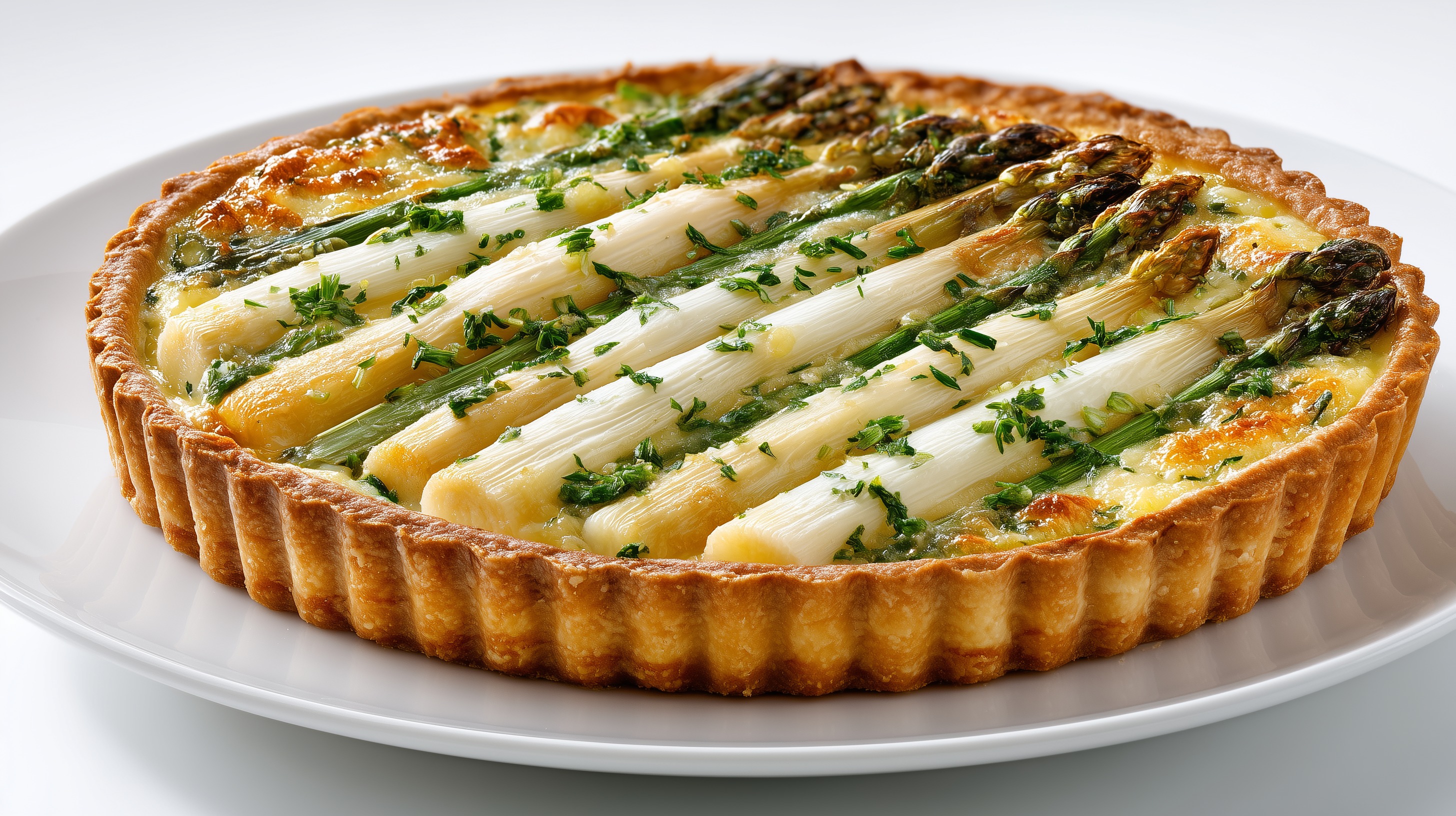 - Den vorgebackenen Tarteboden dünn mit dem restlichen Käse bestreuen. Den Guss gleichmäßig darübergießen. Den weißen und grünen Spargel abwechselnd nebeneinander auf dem Guss anordnen – die Spitzen sollten zur Mitte zeigen oder abwechselnd in entgegengesetzte Richtungen gelegt werden.