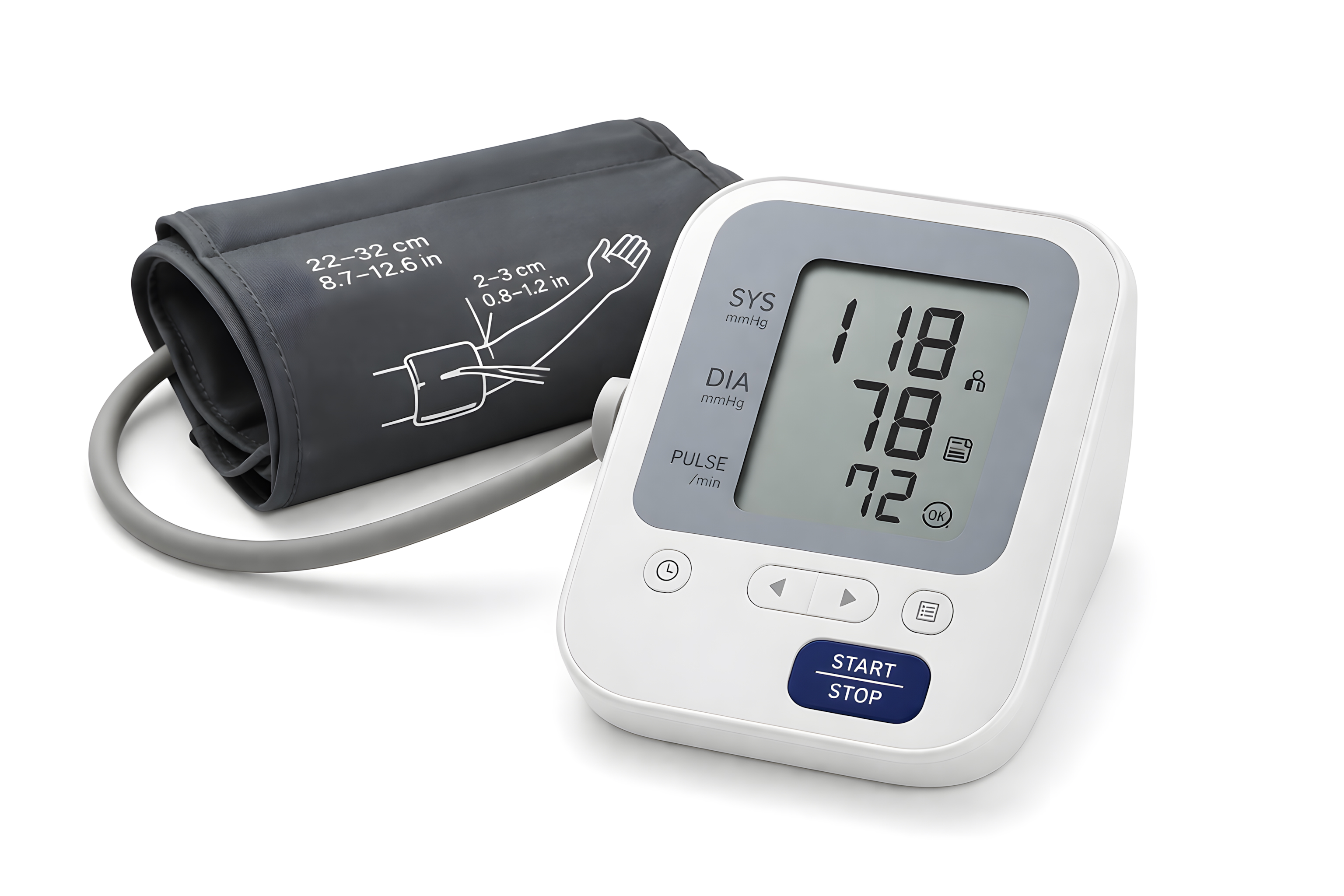 Das Foto zeigt ein modernes digitales Blutdruckmessgerät mit zugehöriger Oberarmmanschette vor weißem Hintergrund als professionelles Produktfreisteller-Bild. Das kompakte, weiß-graue Gerät verfügt über ein gut lesbares LCD-Display, auf dem die drei wichtigsten Messwerte abgebildet sind: der systolische Wert «SYS» mit 118 mmHg, der diastolische Wert «DIA» mit 78 mmHg sowie die Pulsfrequenz von 72 Schlägen pro Minute.
