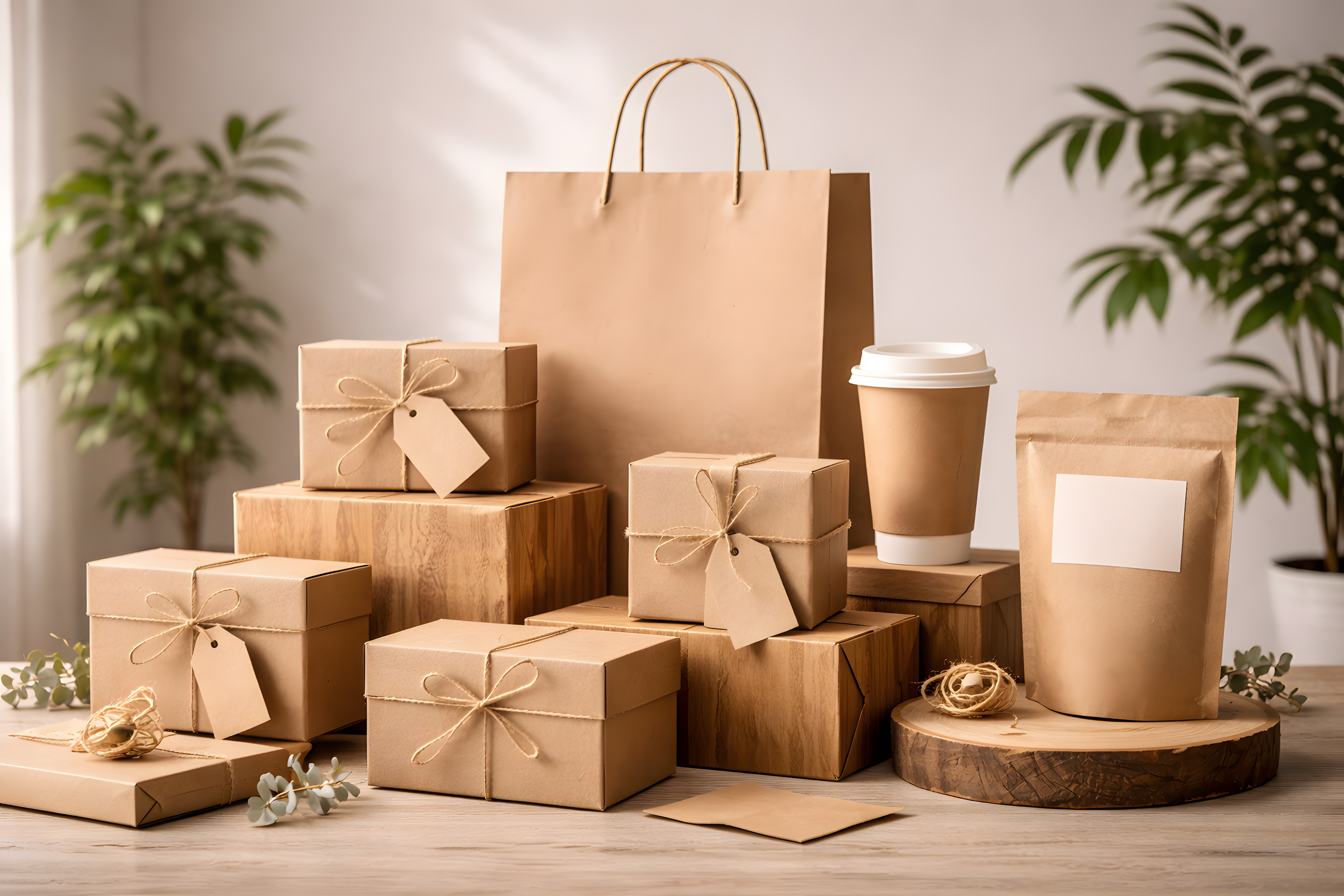 Diese professionelle Produktfotografie zeigt eine stimmungsvolle Komposition aus verschiedenen nachhaltigen Verpackungsmaterialien in harmonischen Braun- und Beigetönen. Im Mittelpunkt stehen mehrere Geschenkboxen aus Kraftpapier, liebevoll mit Juteschnur und Anhängern verziert, die auf natürlichen Holzblöcken und einer Baumscheibe arrangiert sind.