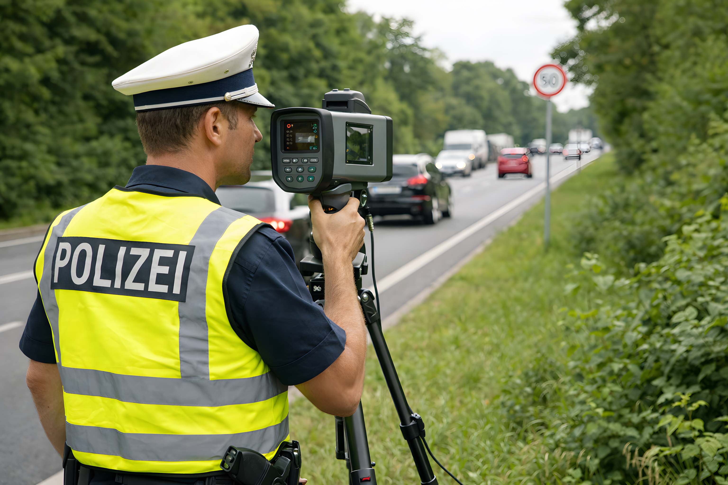 Das Foto zeigt einen deutschen Polizisten in Rückenansicht, der an einem begrünten Straßenrand steht und ein professionelles Radargerät auf einem schwarzen Stativ bedient. Er trägt eine leuchtend gelbe Warnweste mit der Aufschrift «POLIZEI» sowie eine dunkelblaue Uniform und eine weiße Dienstmütze. Im Hintergrund ist eine mehrspurige Straße mit fließendem Fahrzeugverkehr zu erkennen, darunter Pkw und ein Lkw. Ein rundes Verkehrsschild mit einer Geschwindigkeitsbegrenzung ist rechts im Bild sichtbar.