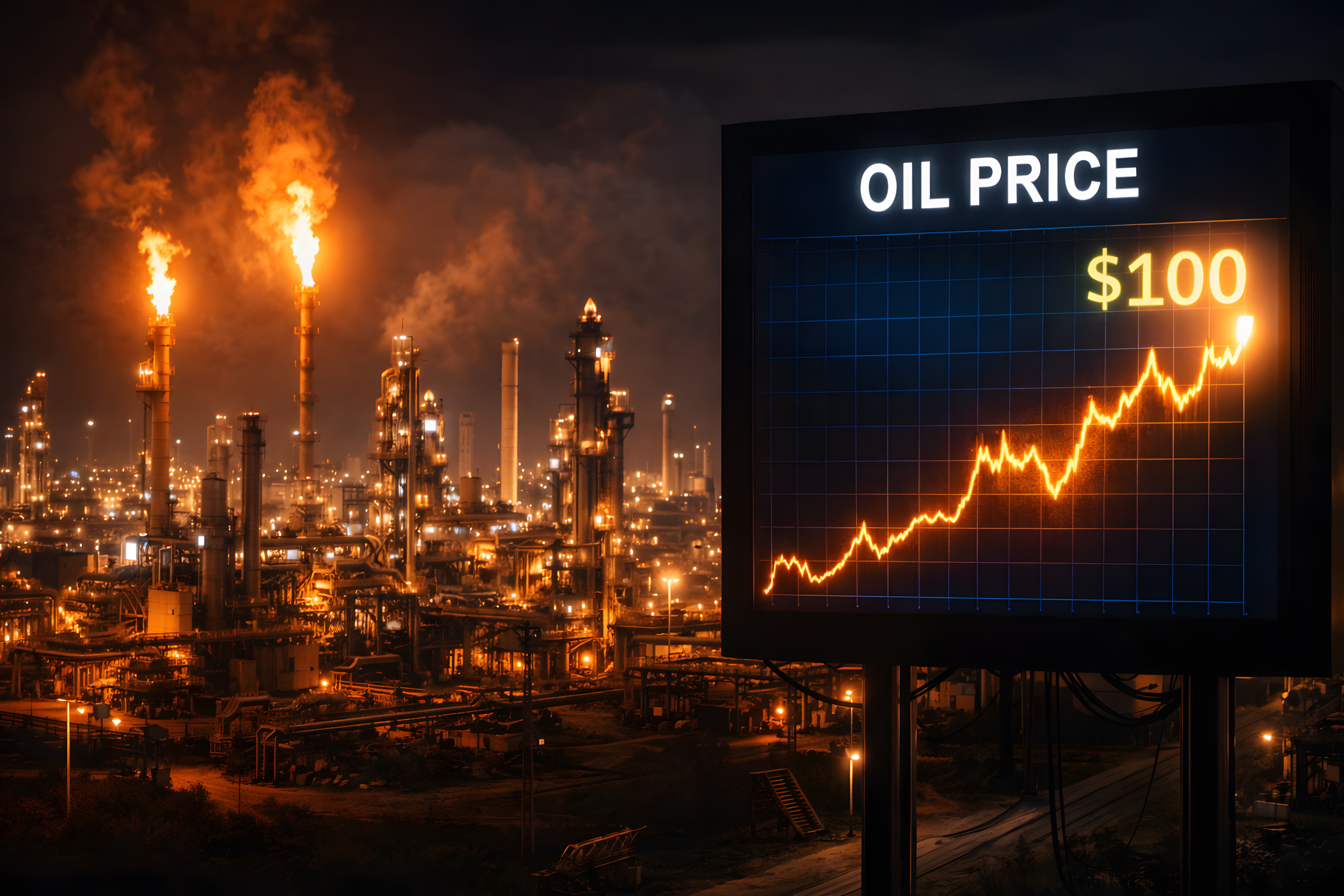 Dieses eindrucksvolle Industriefoto zeigt eine weitläufige Ölraffinerie bei Nacht, beleuchtet von orangefarbenen Flammen der Gasfackeln und dem warmen Glühen zahlreicher Industrielampen. Im Vordergrund rechts ist ein digitales Anzeigetafel mit einem aufsteigenden Preisdiagramm zu sehen, das einen Ölpreis von 100 US-Dollar markiert.