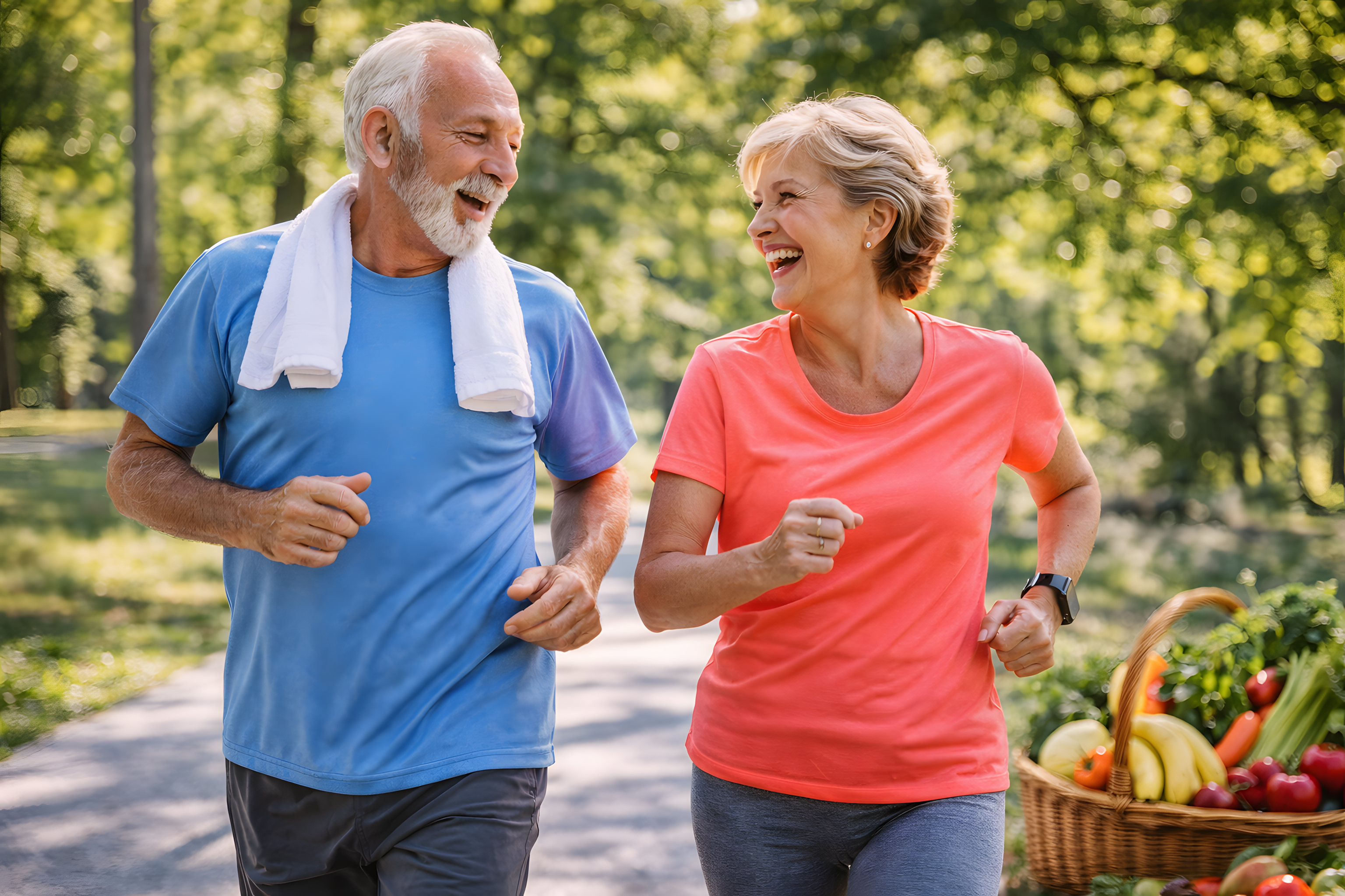 Das Foto zeigt zwei ältere Erwachsene beim gemeinsamen Joggen auf einem asphaltierten Parkweg. Beide lachen sich fröhlich an und vermitteln eine lebendige Energie und positive Lebensfreude. Der Mann trägt ein blaues T-Shirt mit einem weißen Handtuch um den Hals, die Frau ein korallfarbenes T-Shirt sowie eine Smartwatch am Handgelenk. Im Hintergrund sind üppig belaubte Bäume in sattem Grün zu sehen, durchflutet von warmem Sonnenlicht.