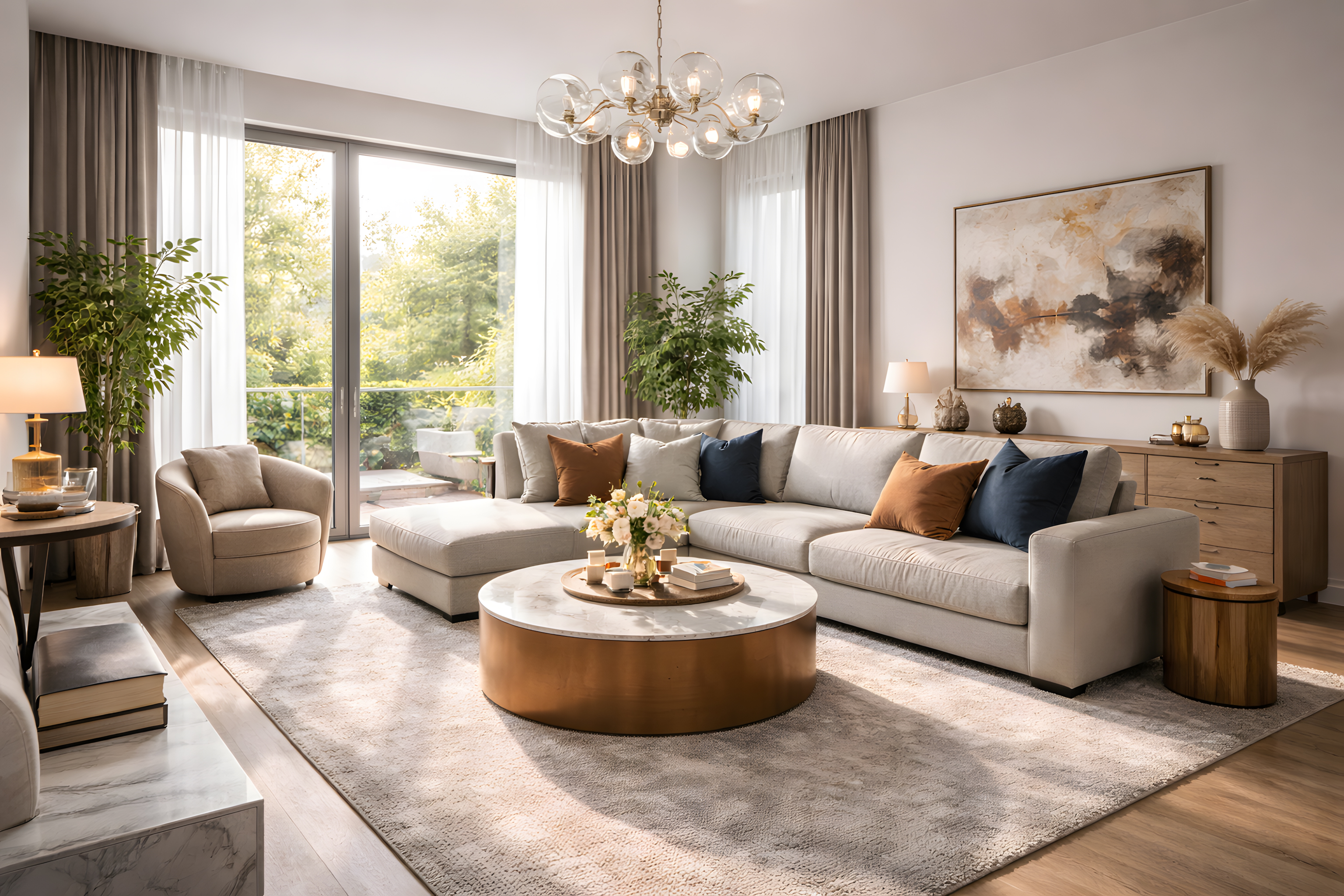 Dieses hochwertige Interiorfoto zeigt ein großzügiges, lichtdurchflutetes Wohnzimmer in einem modernen, eleganten Stil. Im Mittelpunkt steht ein cremefarbenes Ecksofa mit dekorativen Kissen in Kupfer, Beige und Navyblau. Als zentrales Möbelstück dient ein runder Couchtisch mit einer Marmorplatte und einem bronzefarbenen Sockel, auf dem ein Blumenarrangement und Deko-Accessoires arrangiert sind.
