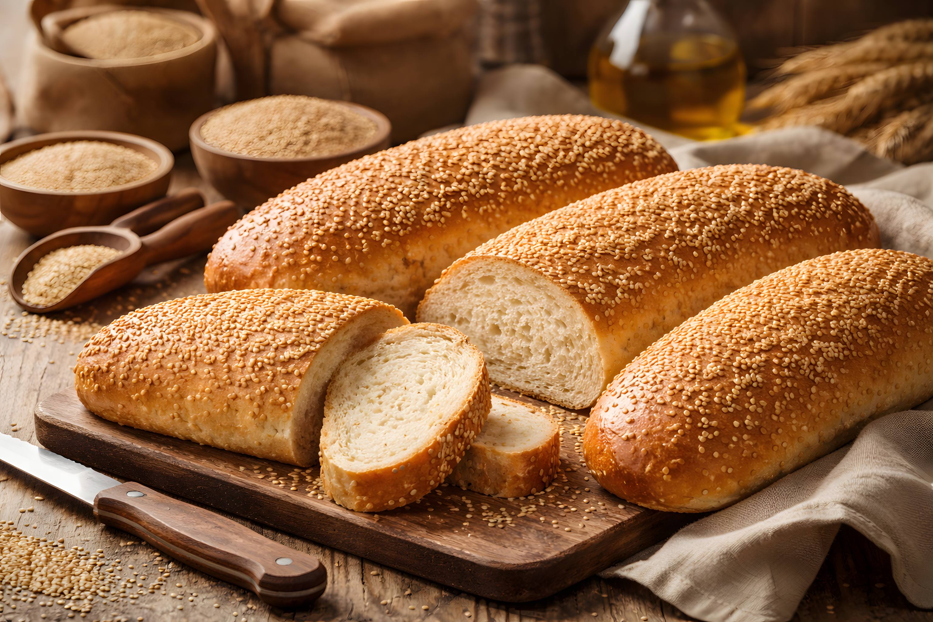 Im Hintergrund sind Holzschüsseln mit Mehl und Sesam, ein Messer mit Holzgriff, ein Fläschchen mit gelbem Olivenöl sowie Weizenähren zu sehen – Elemente, die das Bild zu einer vollständigen Backstuben-Szene machen. Die warme, natürliche Farbpalette aus Goldtönen, Braun und Beige verleiht dem Bild eine gemütliche und appetitliche Stimmung.