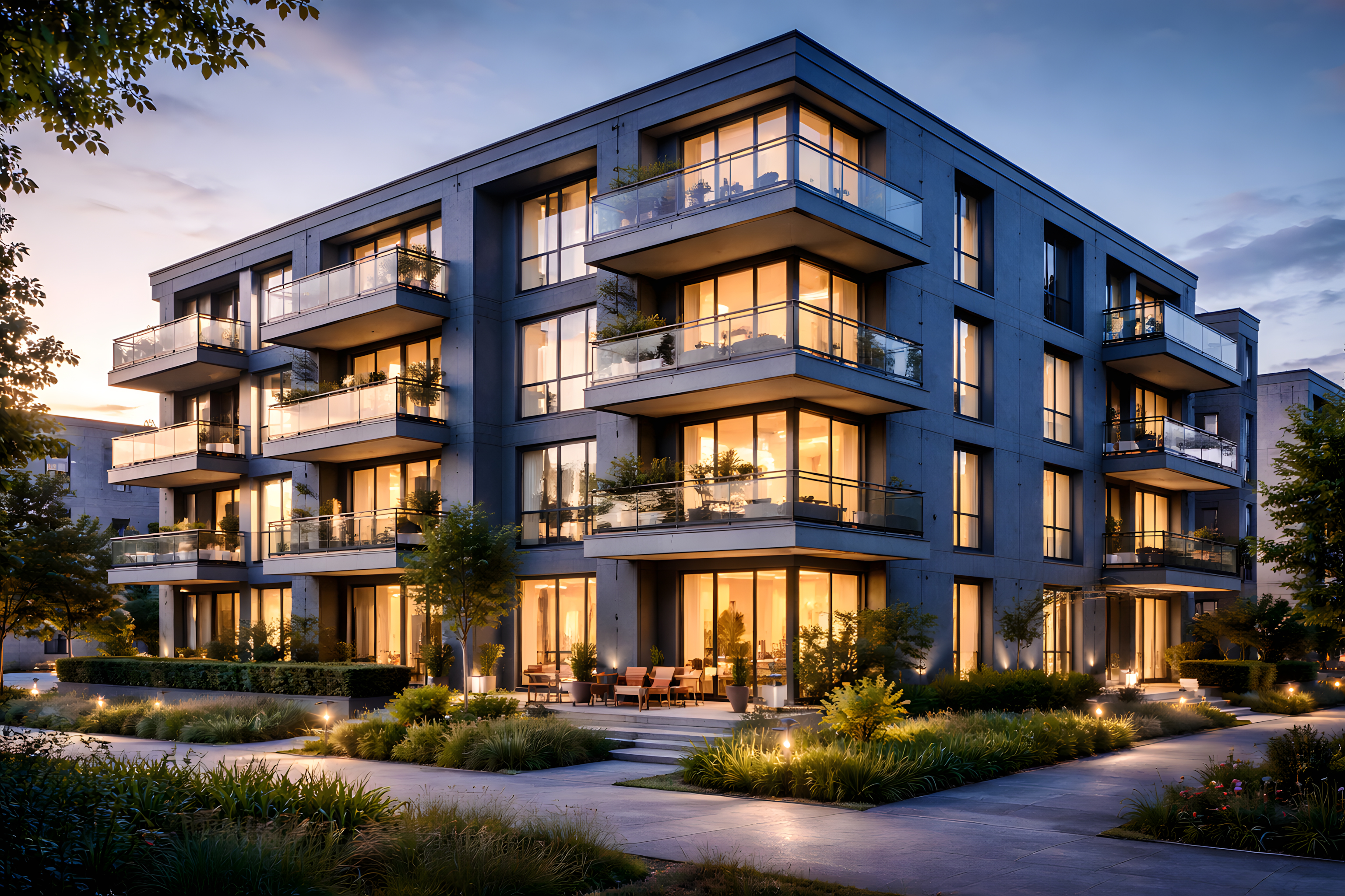 Dieses professionelle Architekturfoto zeigt ein viergeschossiges modernes Wohngebäude in der blauen Stunde. Die Fassade aus grauem Sichtbeton kombiniert großzügige Glasfronten mit auskragenden Balkonen und Glasgeländern, die dem Gebäude eine elegante, zeitgenössische Optik verleihen.