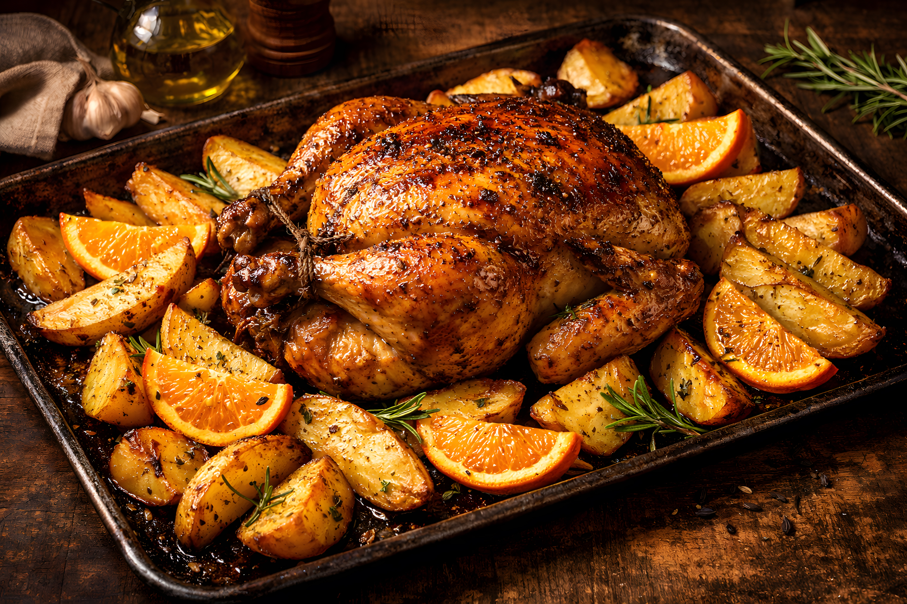 Dieses appetitliche Food-Foto zeigt ein perfekt geröstetes ganzes Brathähnchen auf einem rustikalen, dunklen Backblech. Die goldbraun-knusprige Haut des Hähnchens glänzt verführerisch und ist mit aromatischen Kräutern gewürzt. Das Geflügel ist von reichlich Kartoffelspalten, frischen Rosmarinzweigen und saftigen Orangenscheiben umgeben, die dem Gericht eine mediterrane Note verleihen.