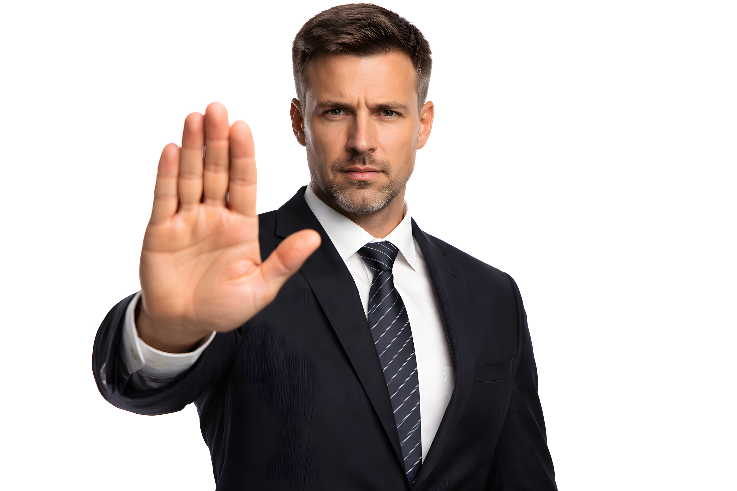 Dieses professionelle Studiofoto zeigt einen gut gekleideten Geschäftsmann in einem dunkelblauen Anzug mit weißem Hemd und gestreifter Krawatte. Er streckt seine rechte Hand mit der Handfläche nach vorne direkt in die Kamera – eine klare und unmissverständliche Stopp-Geste. Sein Gesichtsausdruck ist entschlossen und ernst, der Blick direkt in die Linse gerichtet.