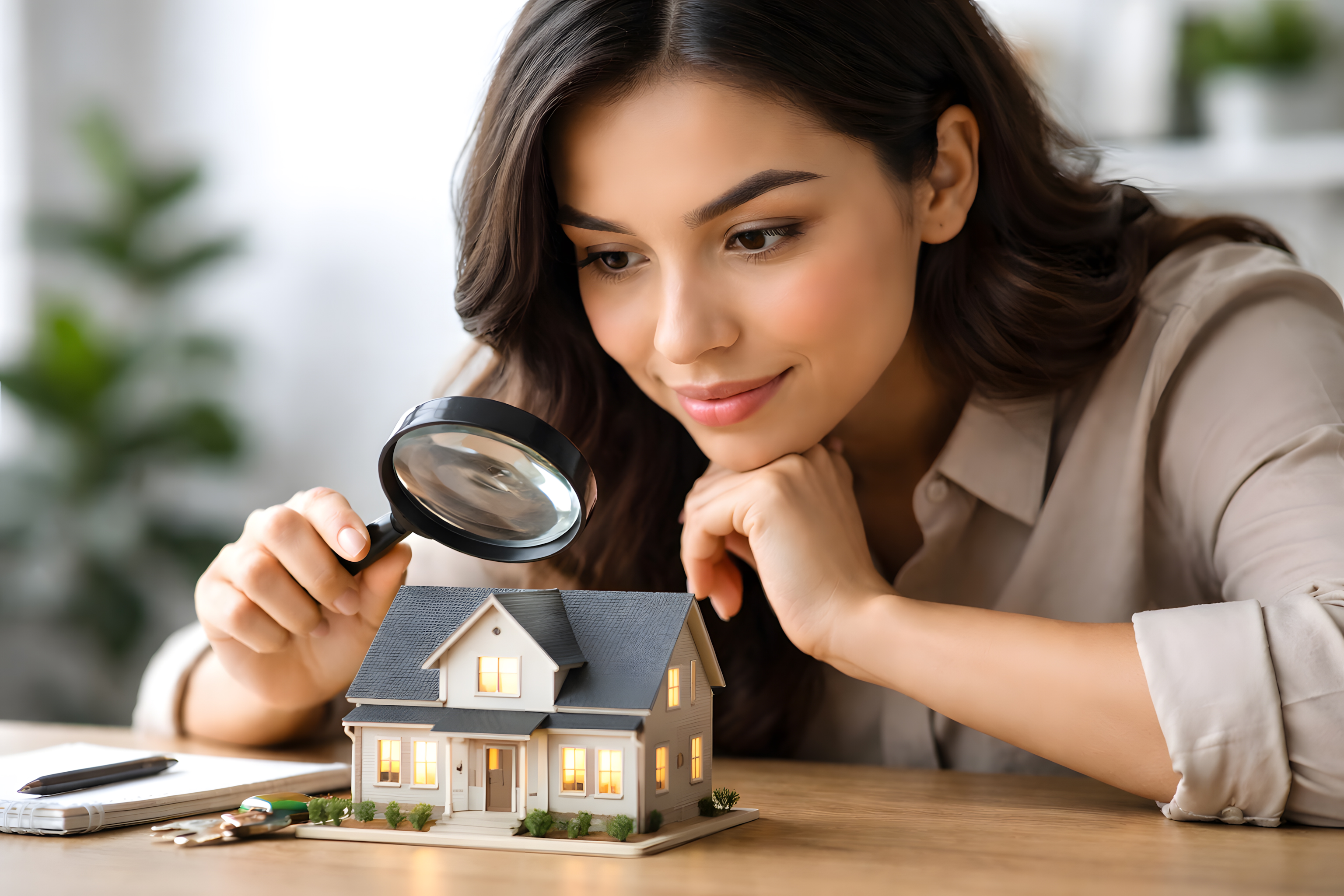 Dieses hochwertige Konzeptfoto zeigt eine junge Frau mit dunklen Haaren und einem leichten Lächeln, die sich über einen Holztisch beugt und ein detailliertes Miniaturhaus durch eine große Lupe betrachtet. Das beleuchtete Hausmodell mit grauem Dach und erleuchteten Fenstern wirkt warm und einladend. Die Frau trägt ein elegantes beiges Hemd und stützt das Kinn auf die freie Hand – eine nachdenkliche, prüfende Körperhaltung.