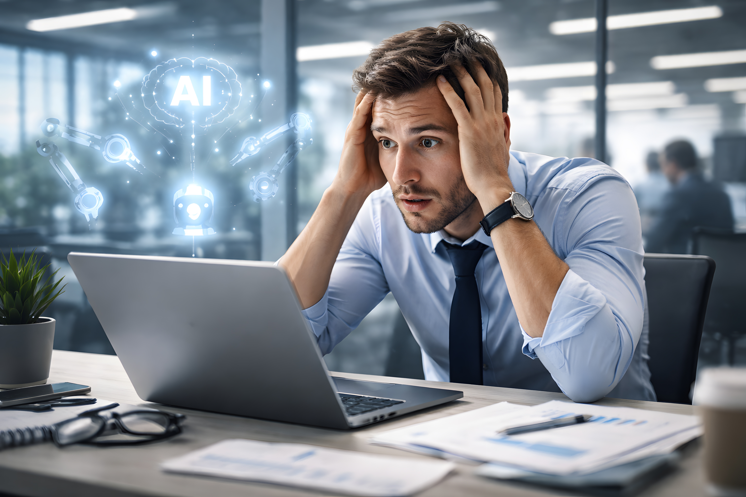 Das Foto zeigt einen jungen Geschäftsmann in hellblauem Hemd und dunkler Krawatte, der mit beiden Händen an seinen Kopf greift und einen Ausdruck tiefer Überraschung oder Überforderung zeigt. Er sitzt an einem modernen Büroschreibtisch vor einem aufgeklappten Laptop, auf dem Tisch liegen Dokumente, eine Brille und ein Smartphone.