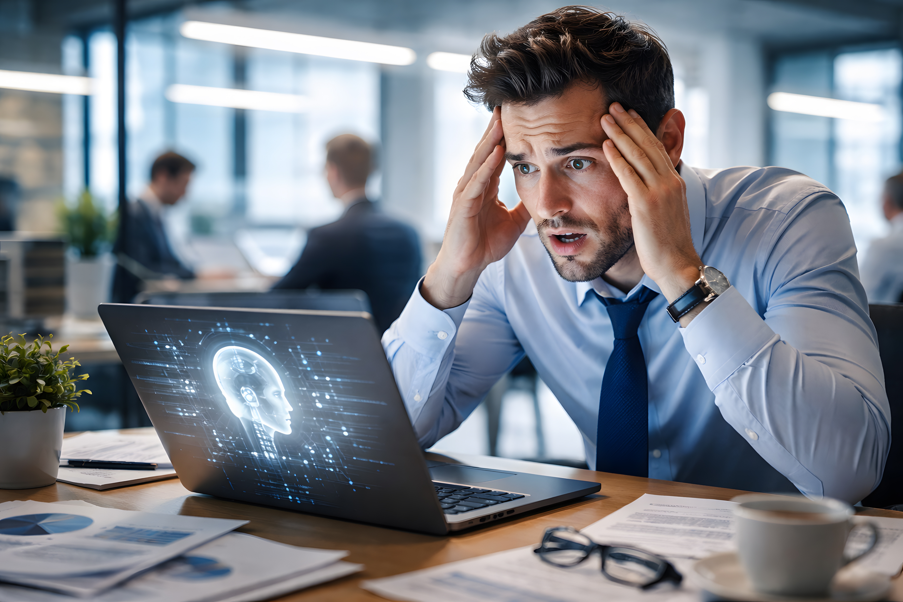 Das Foto zeigt einen jungen Geschäftsmann in hellblauem Hemd und dunkelblauer Krawatte, der mit weit aufgerissenen Augen und beiden Händen an den Schläfen auf seinen Laptop starrt. Seine Mimik drückt deutliche Überraschung oder Schock aus. Auf dem Laptop-Bildschirm ist ein leuchtendes KI-Hologramm in Form eines menschlichen Kopfes mit Schaltkreisen und Datenstrahlen zu sehen.