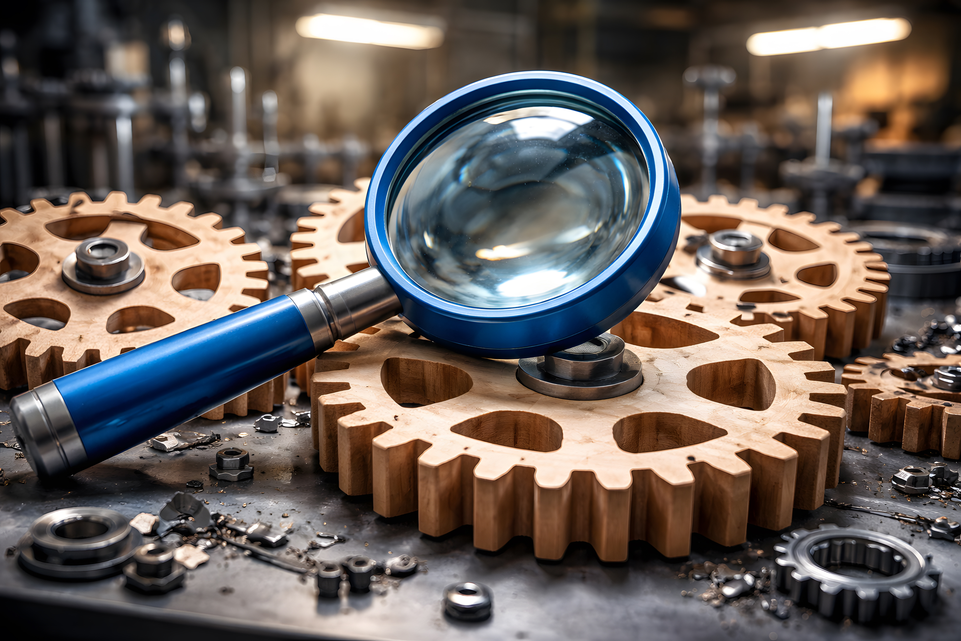 Das Foto zeigt eine blaue Lupe mit silbernem Griff, die auf mehreren großen Holzzahnrädern liegt. Die Holzzahnräder dominieren das Bild mit ihrer warmen Naturholzfarbe und präzise gefrästen Zähnen. Im Hintergrund sind weitere Zahnräder sowie metallische Kleinteile wie Muttern und Schrauben zu erkennen, die auf einer dunklen Arbeitsfläche verstreut liegen.