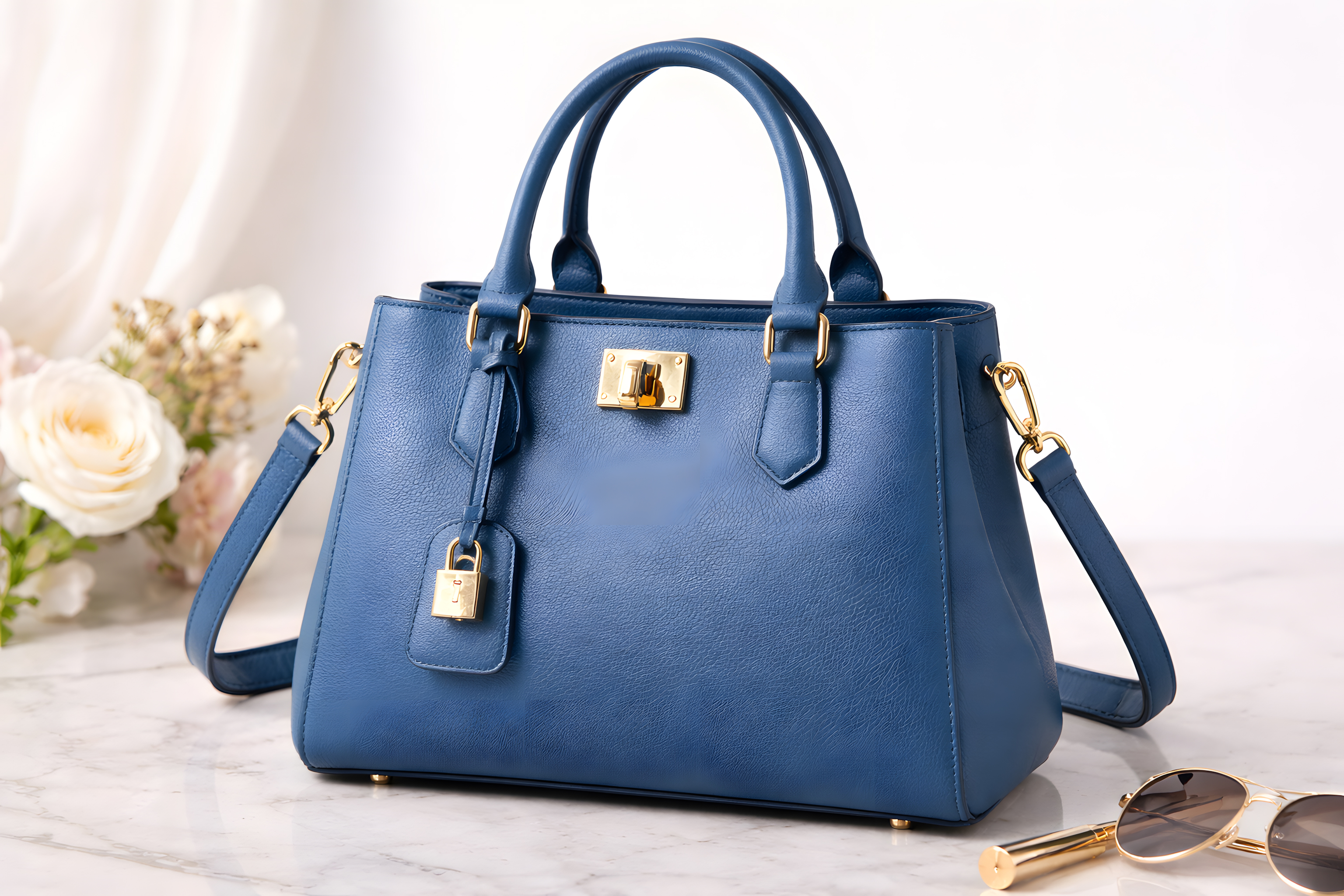 Die Aufnahme ist als klassisches Produktfoto auf einer weißen Marmoroberfläche inszeniert. Im Hintergrund sind dezente weiße Rosen und ein heller Vorhang zu erkennen, die eine feminine und hochwertige Atmosphäre erzeugen. Rechts im Bild liegen Sonnenbrille und ein goldener Lippenstift als stilvolle Accessoires.