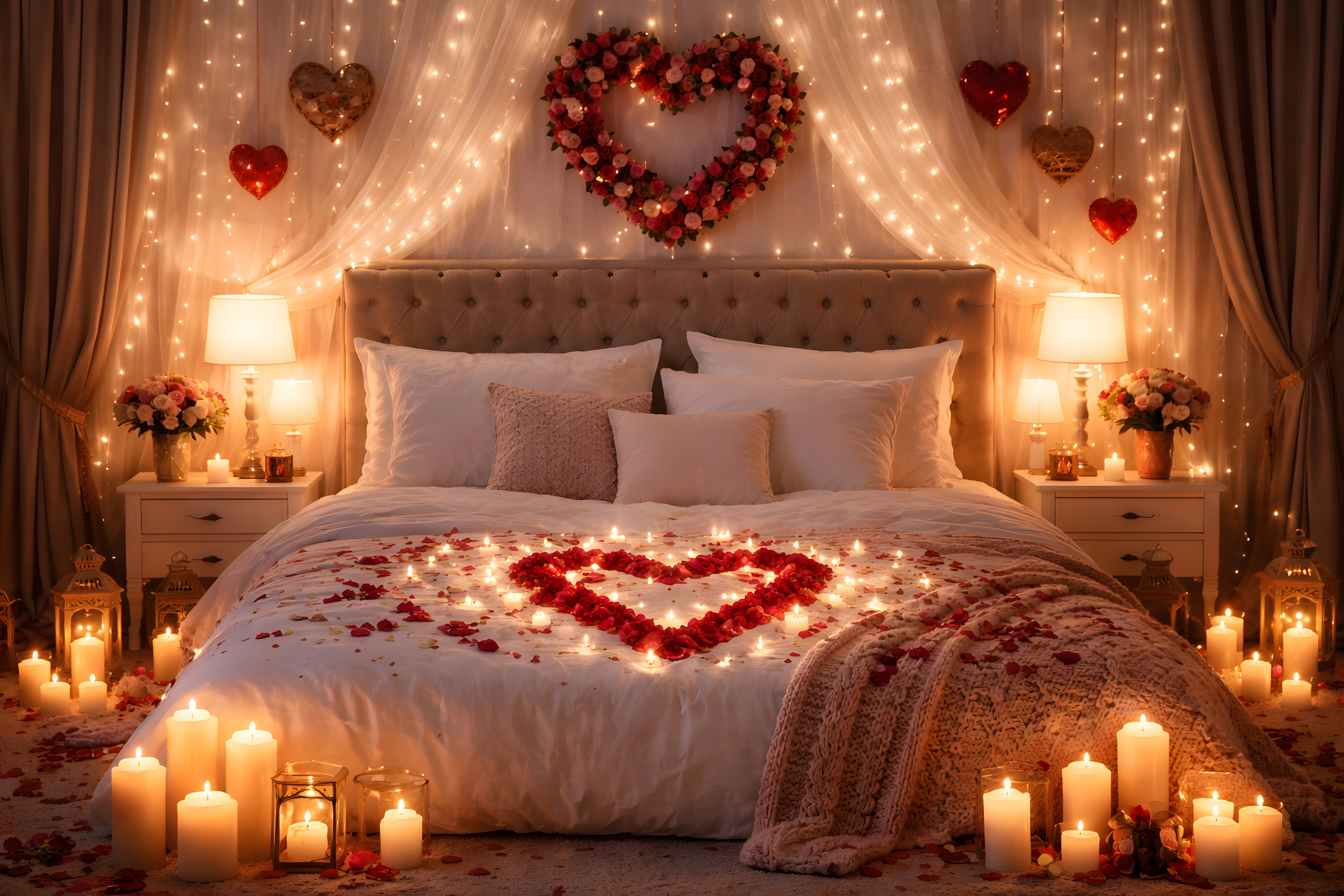 Dieses stimmungsvolle Foto zeigt ein aufwendig dekoriertes Schlafzimmer im romantischen Stil, perfekt für Valentinstag, Hochzeitsnächte oder besondere Liebesüberraschungen. Im Mittelpunkt steht ein breites Doppelbett mit weißer Bettwäsche, auf der rote Rosenblätter ein leuchtendes Herz bilden. Eine Vielzahl weißer Kerzen in verschiedenen Größen beleuchtet den Raum mit warmem, goldenem Kerzenschein.