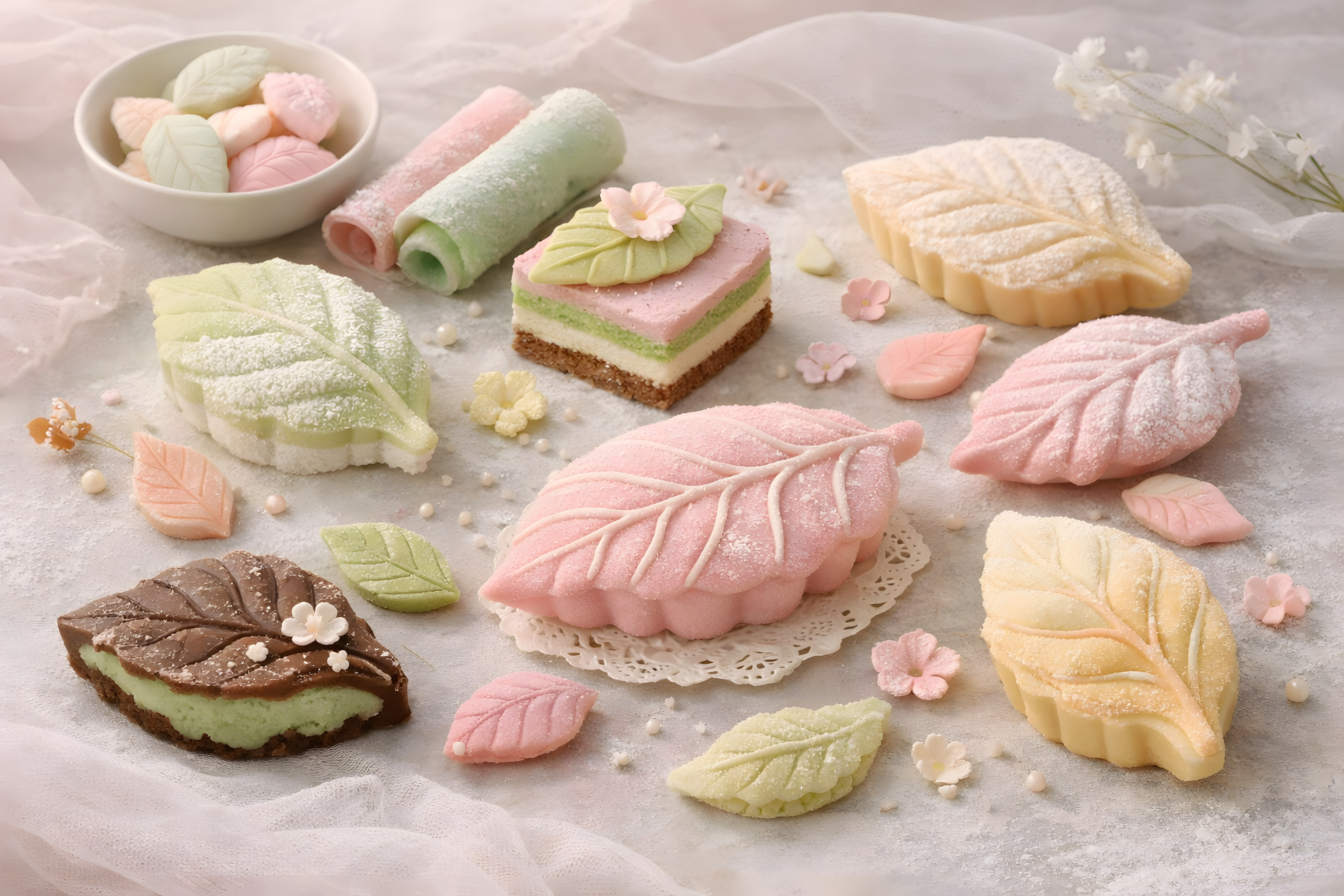 Dieses stimmungsvolle Food-Foto zeigt eine kunstvolle Auswahl asiatischer Süßwaren, die in Blatt- und Naturformen gestaltet wurden. Im Mittelpunkt steht ein großes rosafarbenes Gebäck in Blattform, das auf einem weißen Spitzenuntersetzer liegt und mit feinem Puderzucker bestäubt ist. Rund herum sind weitere Stücke in Pastelltönen wie Mintgrün, Creme, Gelb und Schokoladenbraun arrangiert.
