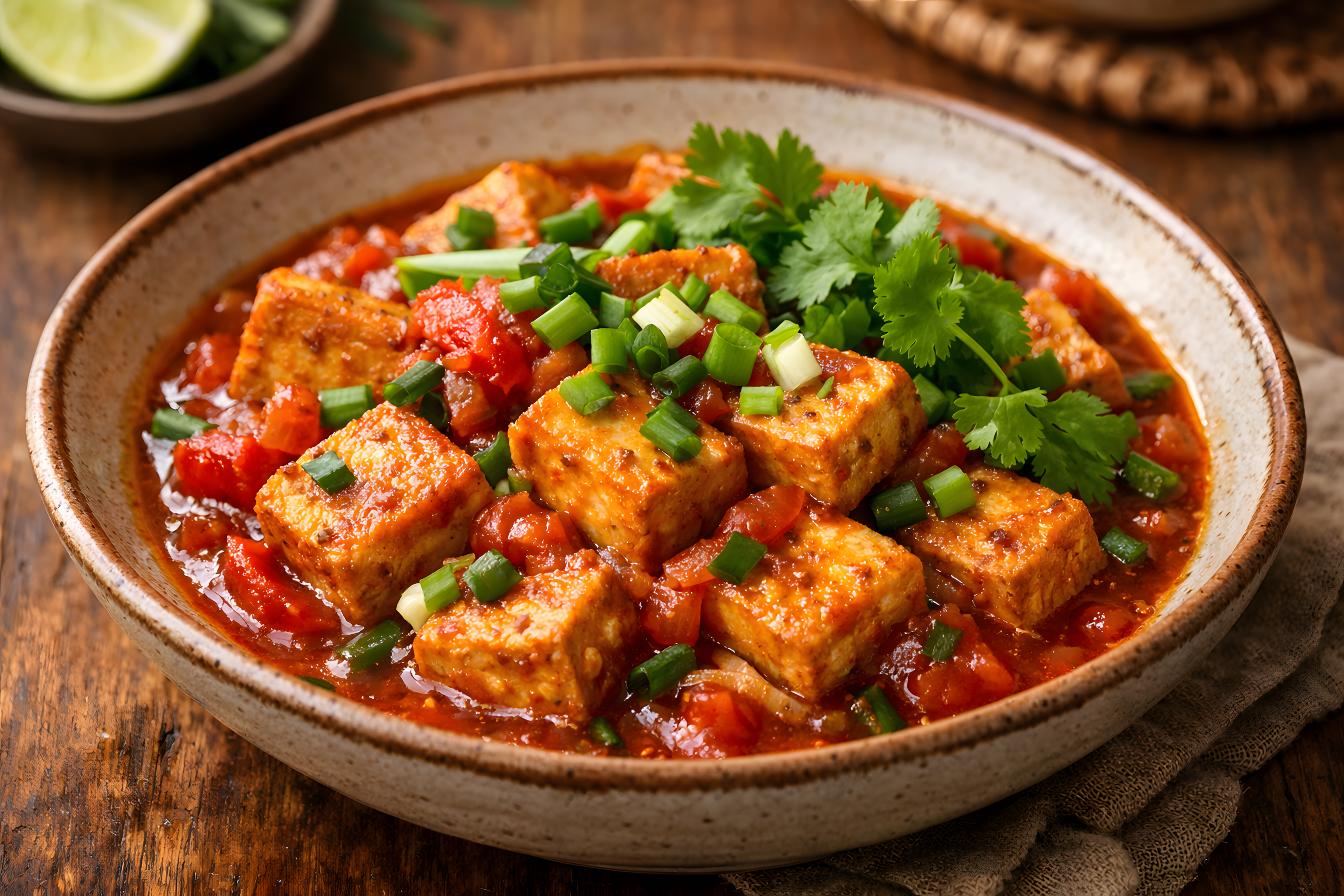 Dieses appetitliche Foodfoto zeigt eine rustikale Keramikschüssel gefüllt mit goldbraun gebratenem Tofu in einer leuchtend roten Tomatensauce. Die Tofu-Würfel haben eine leicht knusprige Oberfläche und sind von einer aromatischen Sauce aus Tomaten, roten Paprikastücken und Gewürzen umgeben. Als frische Garnitur sorgen fein geschnittene Frühlingszwiebeln und großzügig verteilte Korianderblätter für lebendige grüne Akzente.