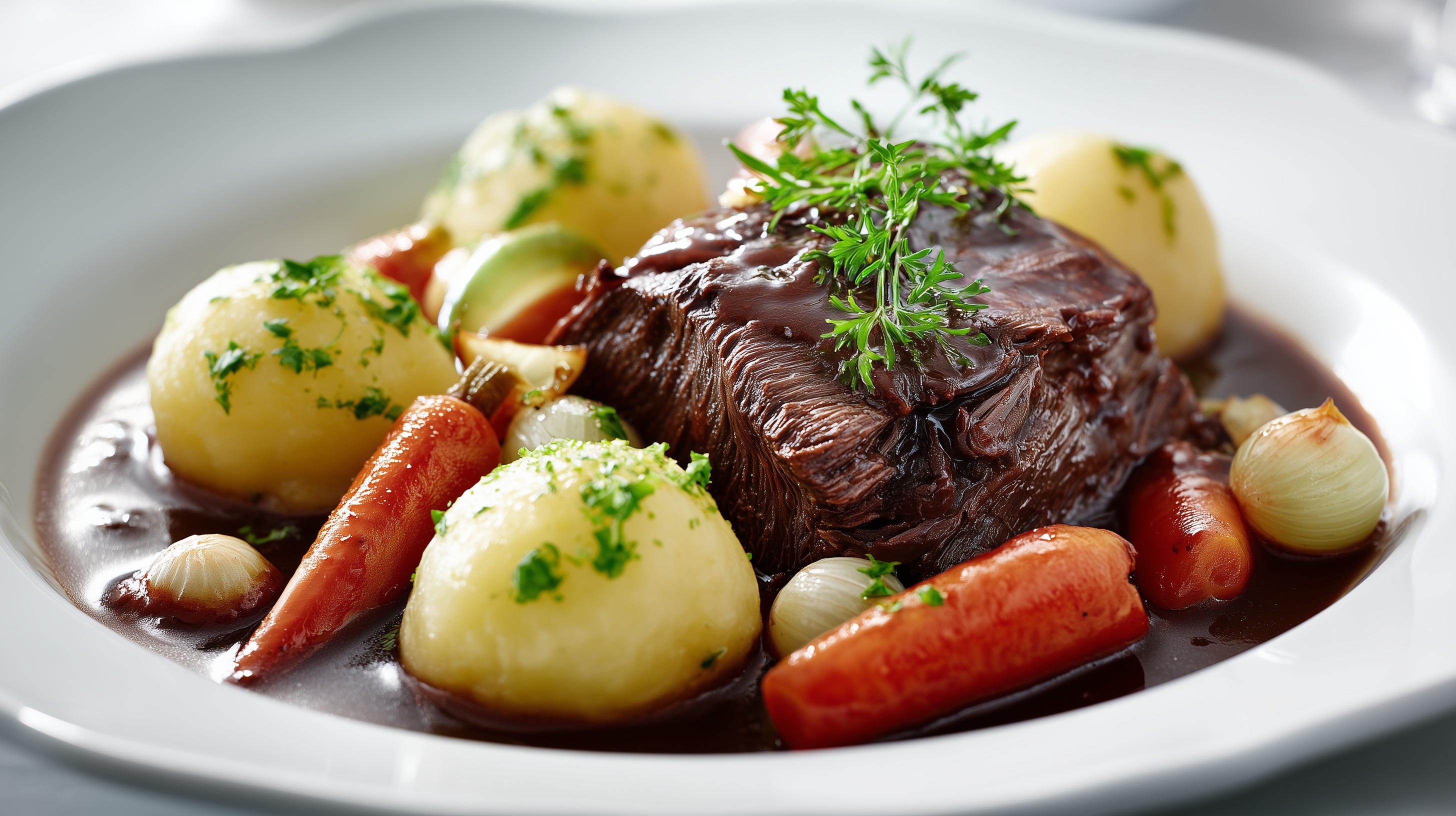 - Den Braten in Scheiben schneiden und zusammen mit den Kartoffeln auf vorgewärmten Tellern anrichten. Die Rotweinsoße großzügig darüber geben und mit frischer Petersilie garnieren. Sofort servieren.
