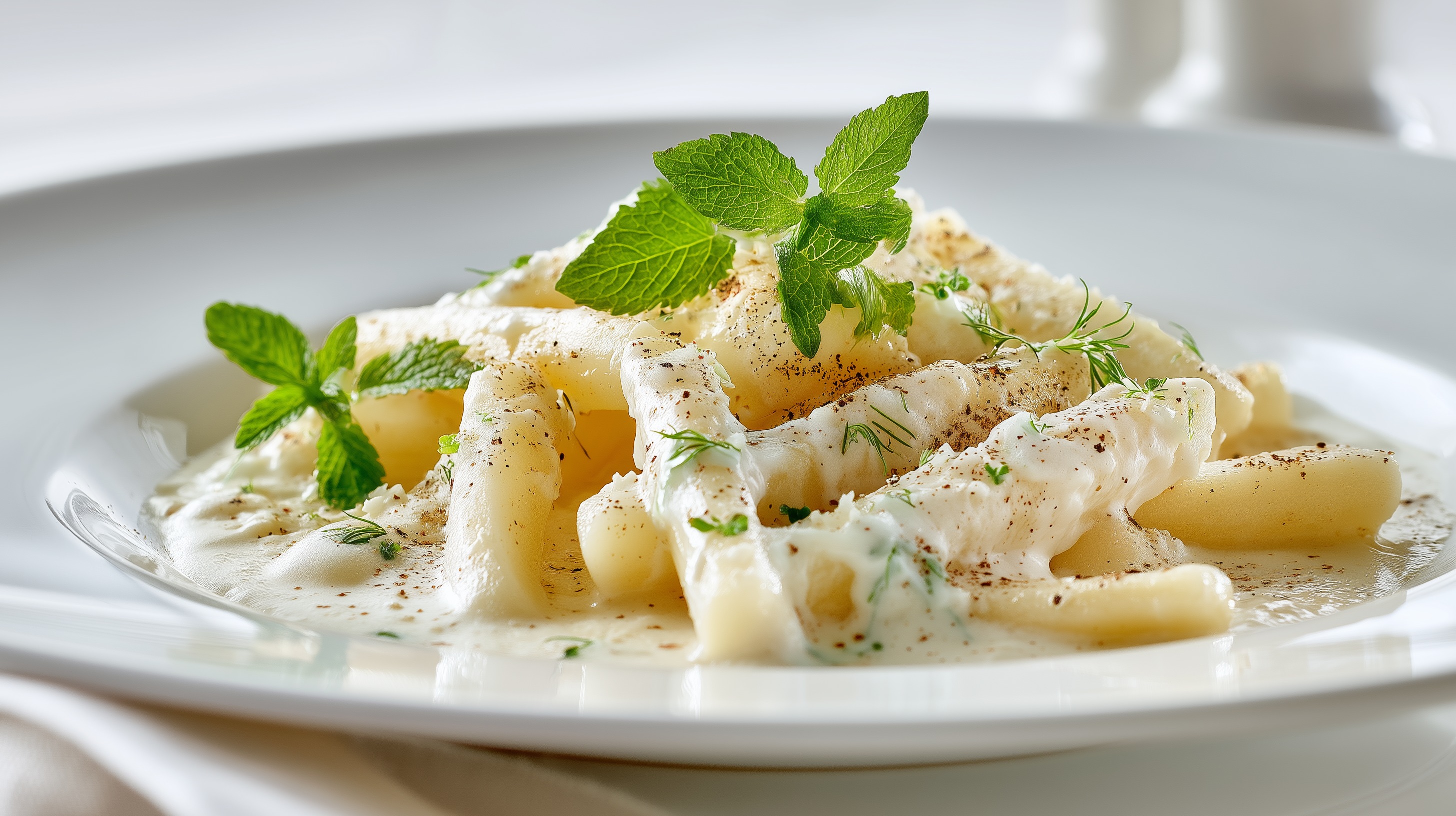 - Ricotta in die Sauce einrühren und bei Bedarf mit etwas Kochwasser des Kohlrabis auf die gewünschte Konsistenz verdünnen. Mit Zitronensaft, Salz, weißem Pfeffer und Muskatnuss abschmecken.