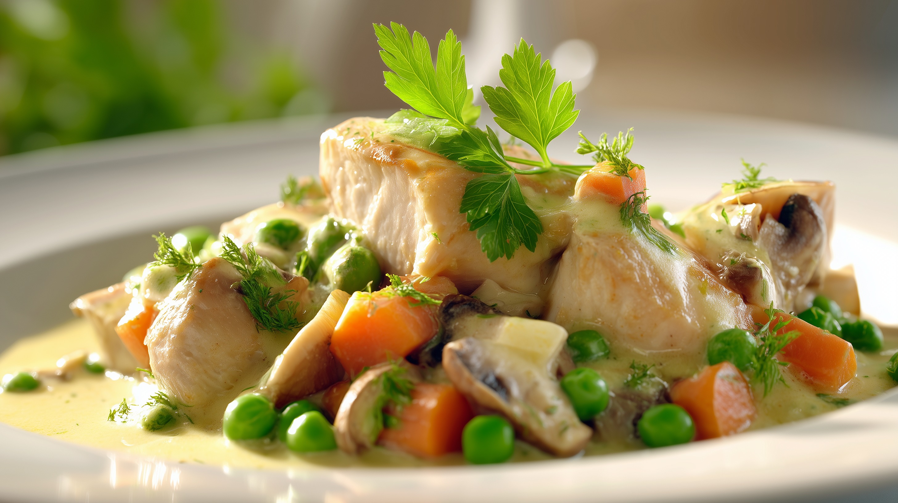 - Das Frikassee auf tiefen Tellern anrichten, mit frisch gehackter Petersilie und Dill garnieren. Dazu passen Reis, Nudeln oder frisches Baguette.