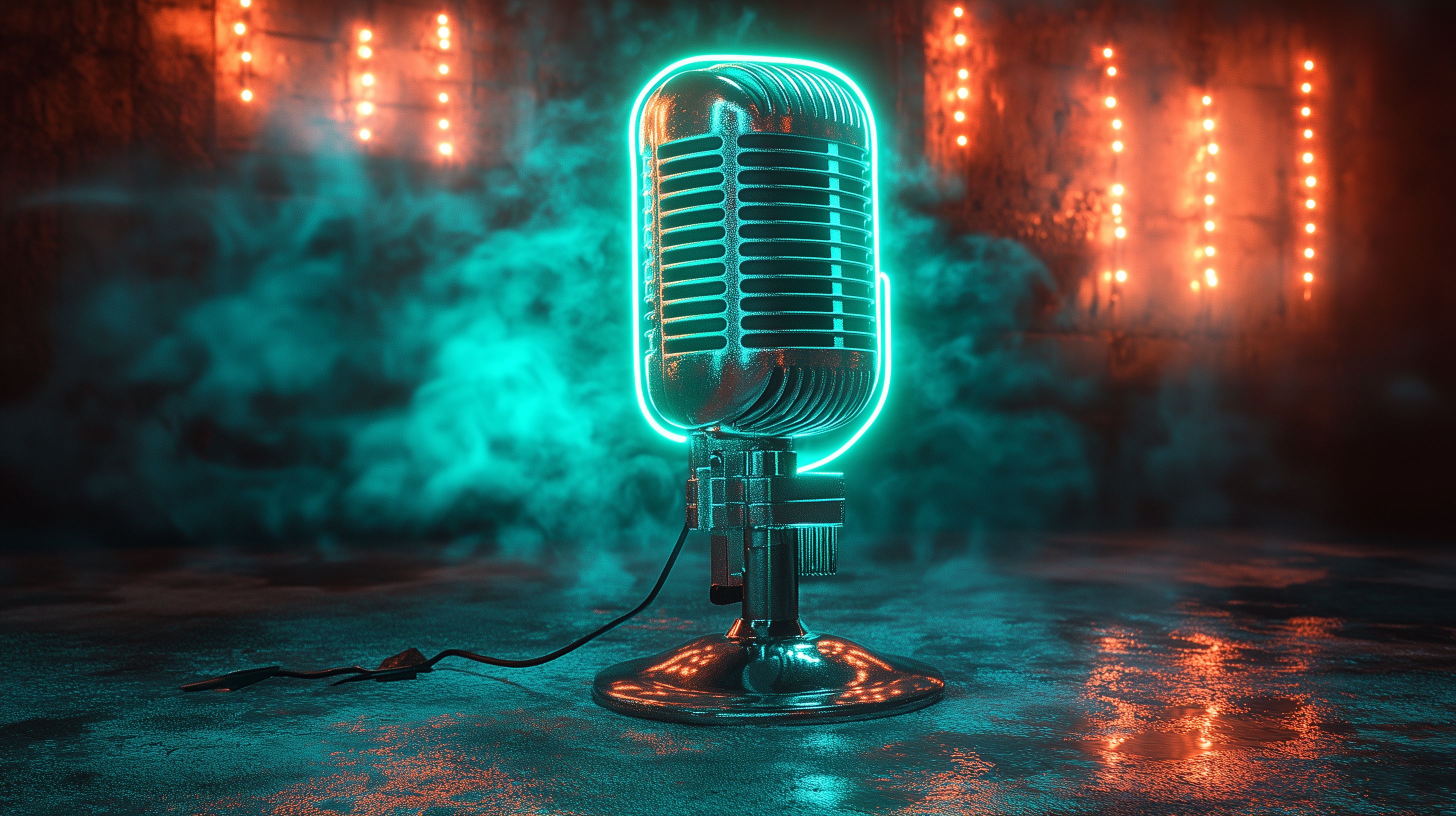 Das Bild zeigt ein altes, neonbeleuchtetes Retro-Mikrofon, das in einer nebeligen, dunklen Umgebung platziert ist. Das Mikrofon strahlt in einem kräftigen Grünton, während im Hintergrund orangerote Lichter zu sehen sind, die eine Bühnenbeleuchtung oder Kulisse andeuten. Die Szenerie vermittelt eine geheimnisvolle, mystische Stimmung, die perfekt für Musik-, Audio- oder Bühnenprojekte geeignet ist. Dieses kostenloses Stockfoto in hoher Auflösung steht unter einer Creative-Commons-Lizenz zur Verfügung und kann für verschiedenste Zwecke wie Blogs, Social-Media-Posts, Werbekampagnen oder Grafikdesigns verwendet werden.