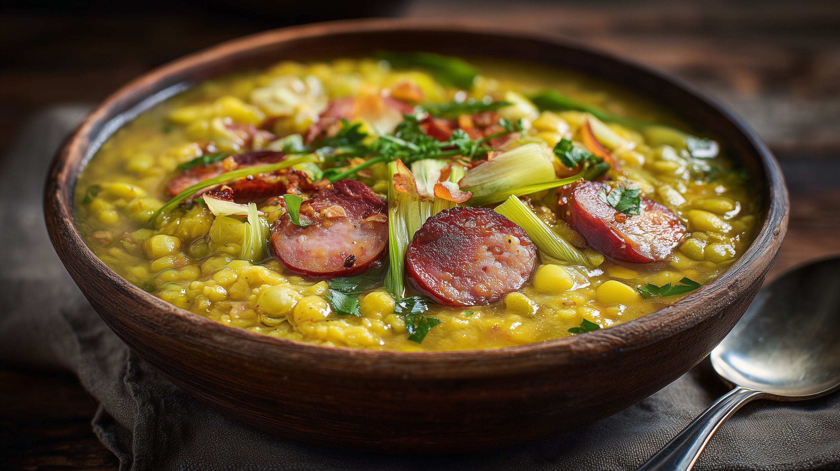 - Den Eintopf in tiefen Tellern oder Schüsseln anrichten, die gebratenen Wurstscheiben und den knusprigen Speck obenauf verteilen und mit frischer Petersilie garnieren.