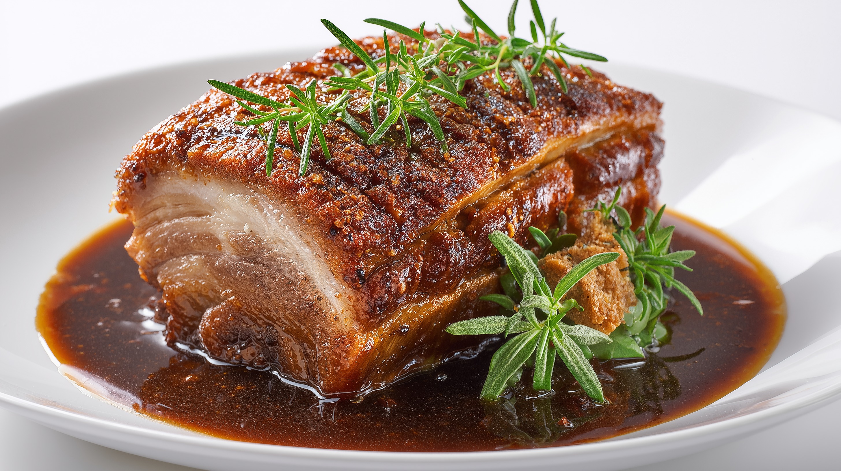 - Das Fleisch in Scheiben oder Stücke schneiden, auf vorgewärmten Tellern mit der dunklen Brotsoße anrichten und mit frischem Rosmarin und Thymian garnieren. Dazu passen Kartoffelknödel, Semmelknödel oder Blaukraut.