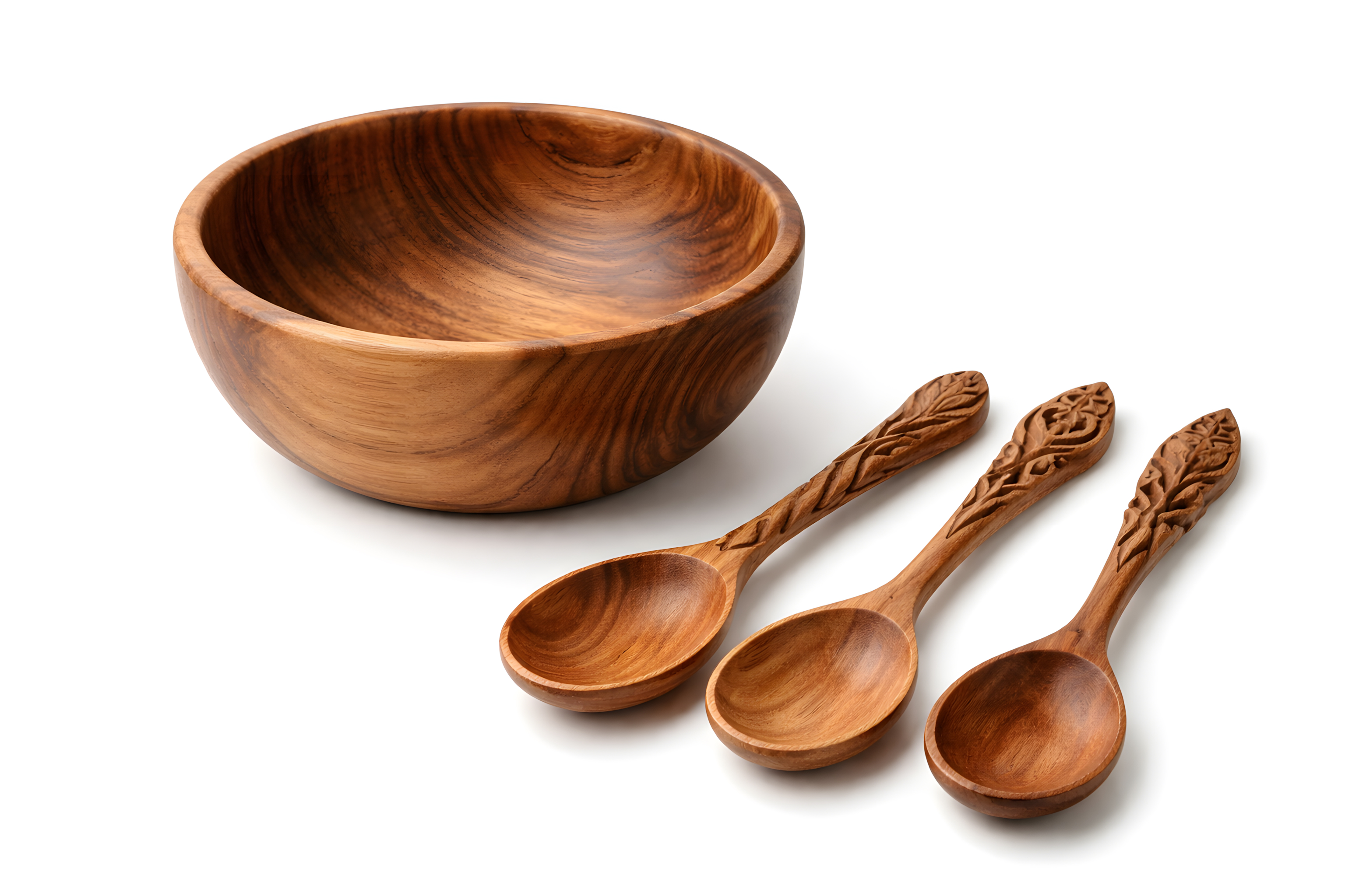 Das Foto zeigt eine großzügige handgefertigte Holzschüssel zusammen mit drei verschieden großen Holzlöffeln auf weißem Hintergrund. Die Schüssel besticht durch eine ausgeprägte natürliche Holzmaserung in warmen Brauntönen, die an Teakholz oder ein ähnliches edles Massivholz erinnert. Die glatte, polierte Oberfläche verleiht dem Stück eine hochwertige Optik.
