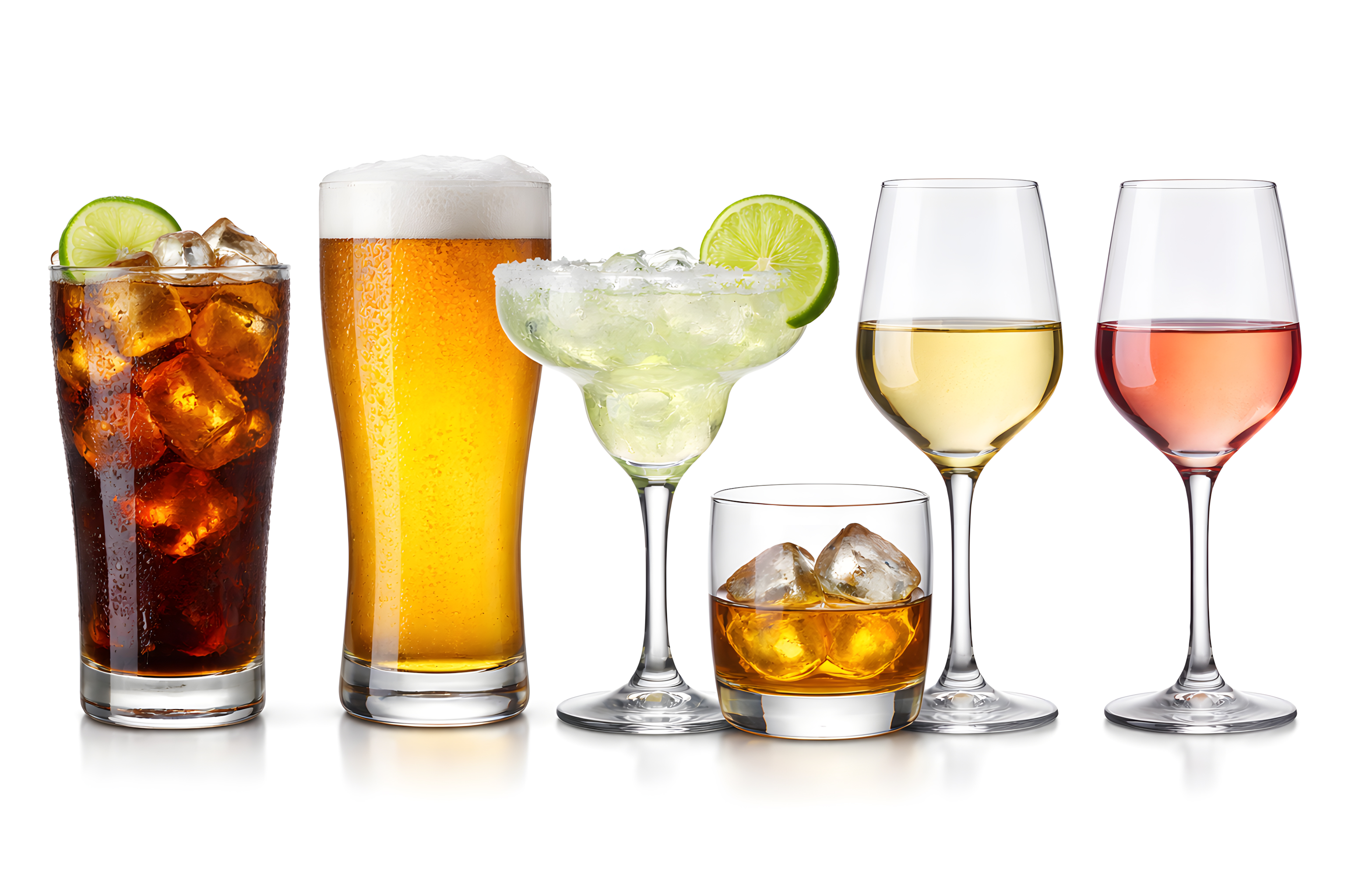 Diese professionelle Studioaufnahme zeigt eine sorgfältig arrangierte Auswahl von sechs verschiedenen Getränken in typischen Bargläsern, freigestellt vor einem reinen weißen Hintergrund. Von links nach rechts sind zu sehen: ein Longdrink mit Cola und Eiswürfeln, garniert mit einer Limettenscheibe, ein hohes Bierglas mit goldenem Lagerbier und weißem Schaum, ein klassischer Margarita mit Salzrand und frischer Limette, ein Tumbler mit Whisky on the Rocks, ein Weißwein sowie ein Rosé im eleganten Weinglas.