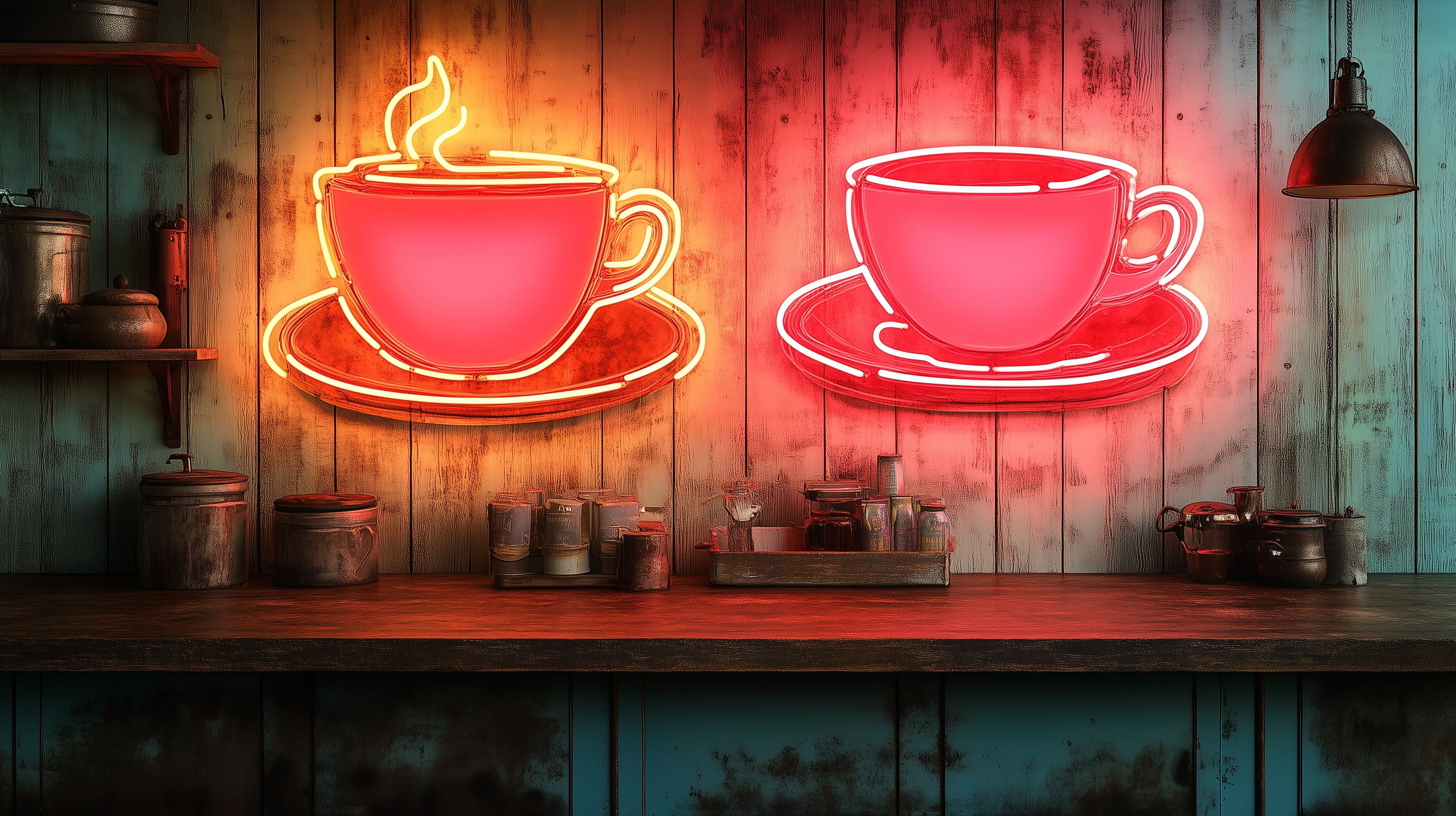 Dieses farbenprächtige Bild zeigt ein rustikales Café-Ambiente mit auffallenden Neon-Kaffeetassen an der Wand. Die warm leuchtenden Rot- und Orangetöne der Tassen sowie die türkise Holzvertäfelung schaffen eine gemütliche, nostalgische Atmosphäre. Im Vordergrund sind weitere Accessoires wie Metalllampen und Kaffeedosen zu sehen, die den Vintage-Charakter des Cafés unterstreichen. Diese Aufnahme eignet sich hervorragend als kostenloses Stockfoto für Blog-Beiträge, Social-Media-Posts oder Werbeanzeigen rund um Kaffee, Gastronomie und Lifestyle-Themen in hoher Auflösung und unter Creative-Commons-Lizenz.