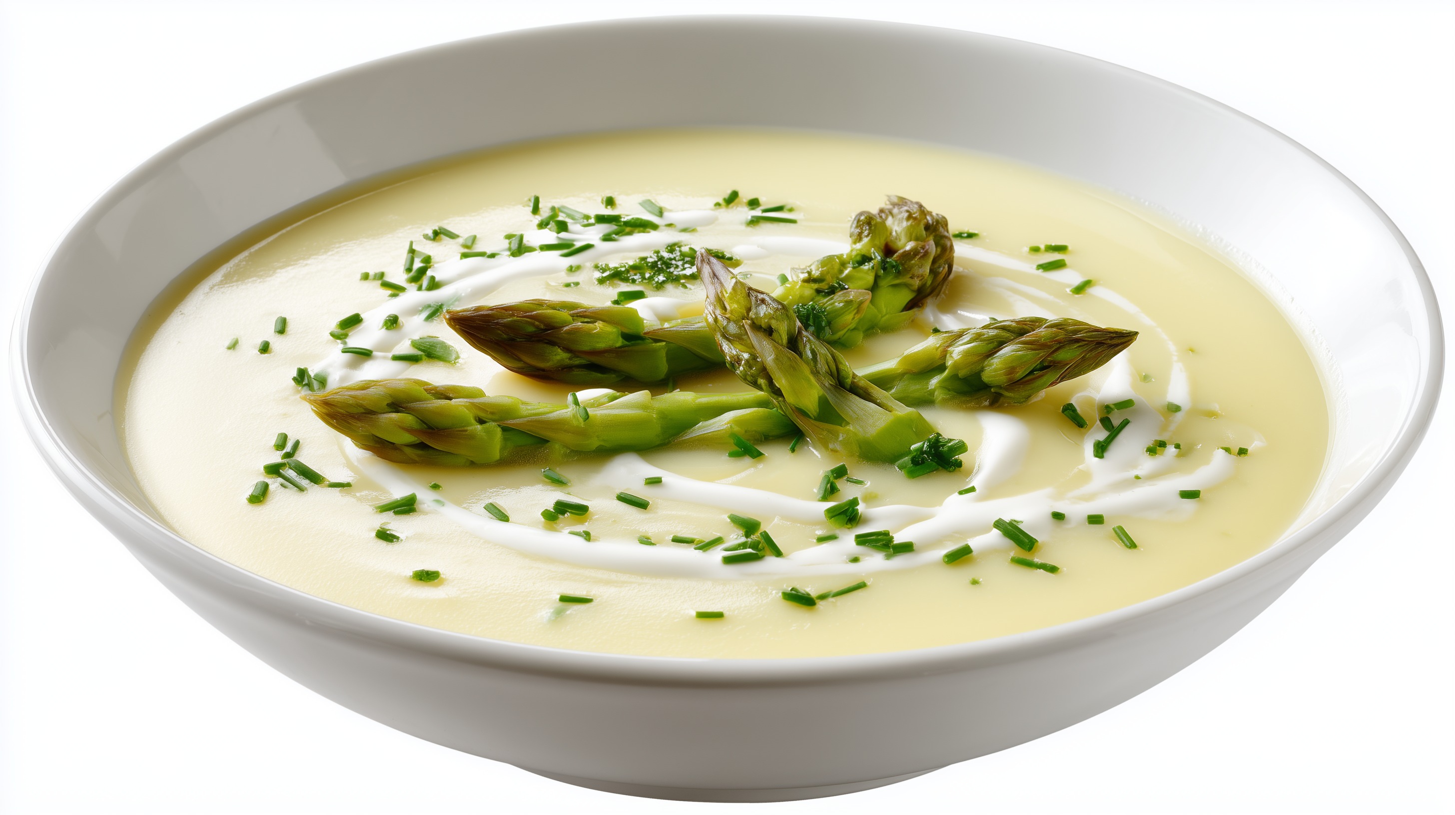 - Die Suppe in vorgewärmte tiefe Teller füllen. Je einen Klecks Crème fraîche spiralförmig einrühren, die blanchierten Spargelspitzen in die Mitte setzen, mit Schnittlauch bestreuen und mit einigen Tropfen Olivenöl beträufeln.