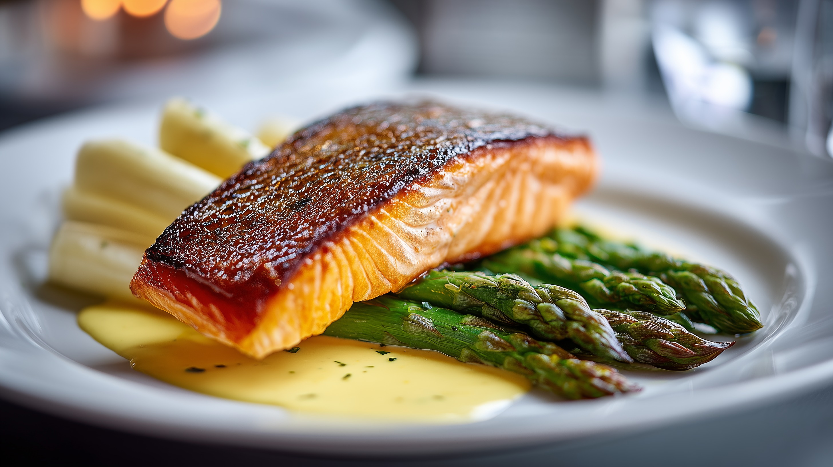 - Anrichten: Den weißen und grünen Spargel nebeneinander in der Mitte des Tellers anordnen. Das Lachsfilet mit der knusprigen Hautseite nach oben darauflegen. Die Buttersauce großzügig um und über den Spargel gießen. Sofort servieren.