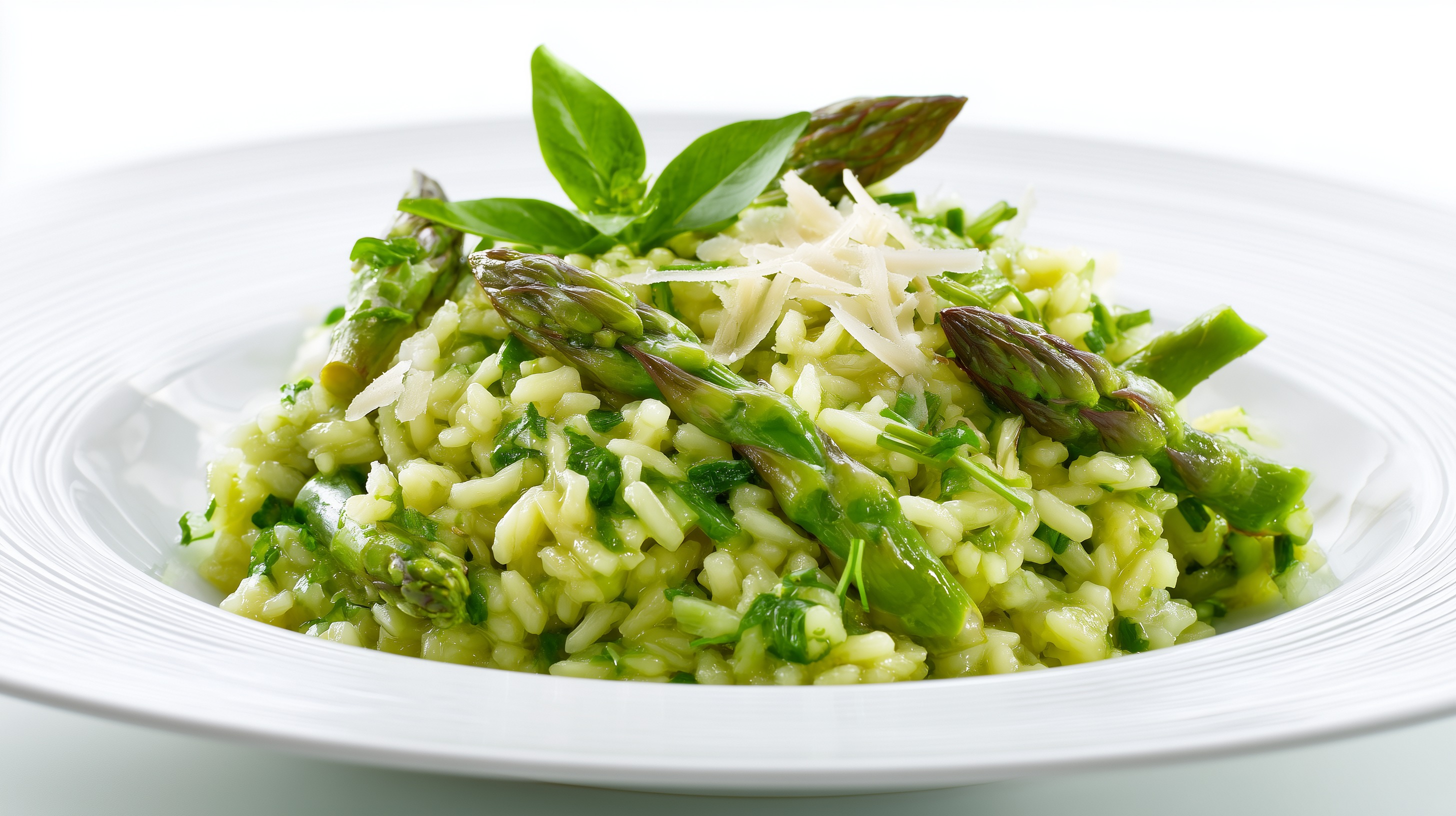 - Sofort auf vorgewärmte tiefe Teller anrichten, mit den gebratenen Spargelspitzen belegen und mit Parmesanspänen, frischem Bärlauch sowie Basilikumblättern garnieren.
