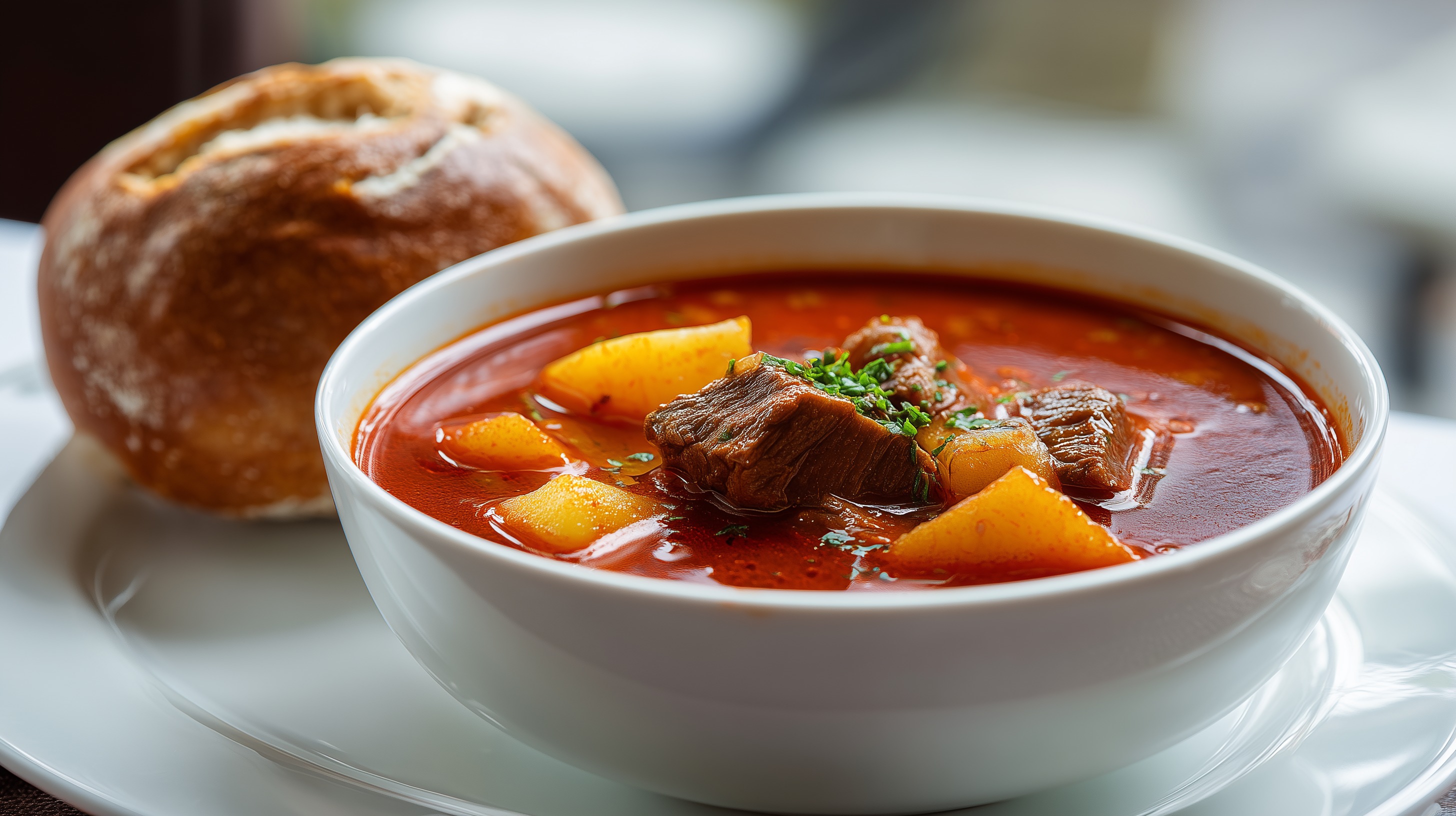- Die Gulaschsuppe in tiefen Tellern anrichten, mit frisch gehackter Petersilie bestreuen und mit je einem knusprigen Brötchen servieren.