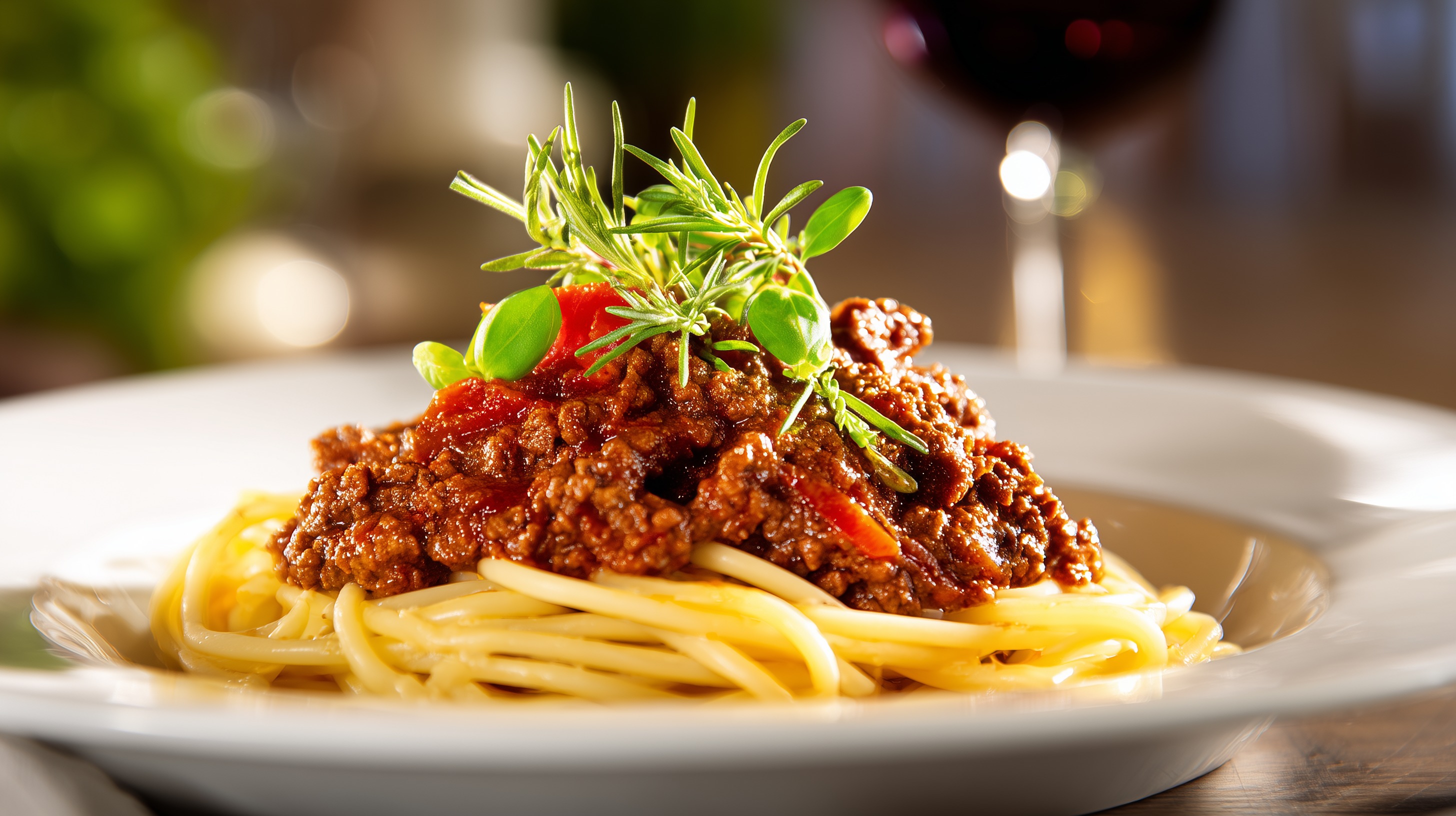 - Spaghetti abgießen, auf Teller verteilen, Bolognese darüber geben und mit frischem Rosmarin sowie Oregano garnieren. Nach Wunsch mit frisch geriebenem Parmesan servieren.