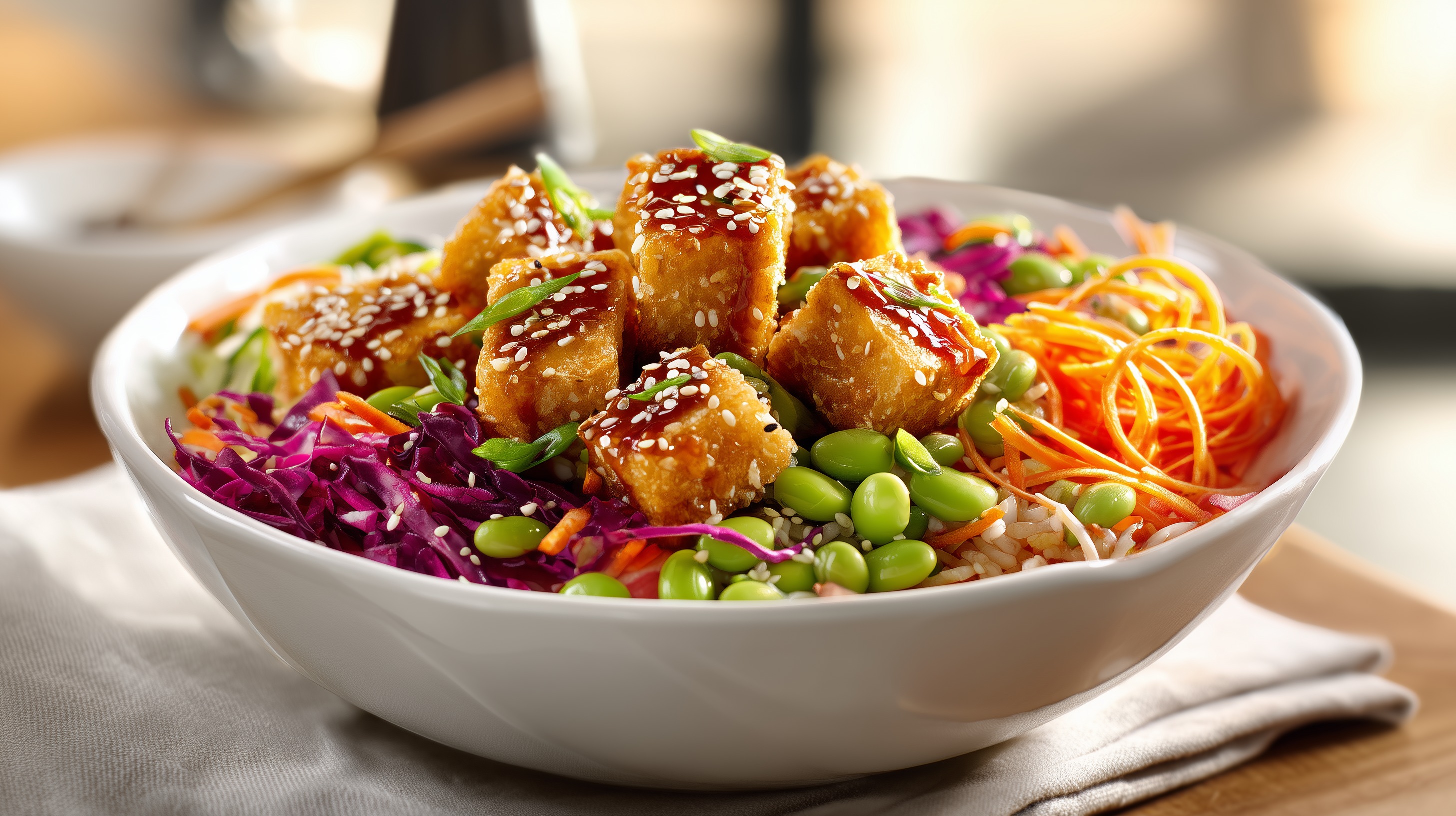 Tipp: Für extra Knusprigkeit den bestäubten Tofu vor dem Braten 10 Minuten im Kühlschrank ruhen lassen. Wer es noch würziger mag, kann die fertige Bowl mit einem Spritzer Limettensaft und etwas zusätzlicher Sriracha verfeinern. Der Rotkohl kann bereits am Vortag mariniert werden – er wird dadurch noch zarter und aromatischer.
