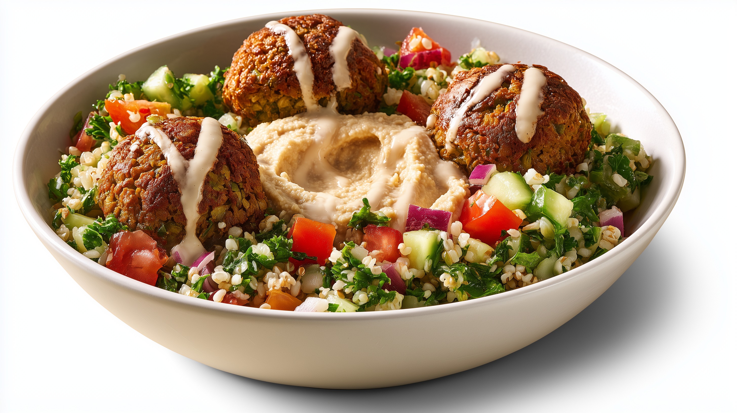 - Bowl zusammenstellen: Das Tabulé gleichmäßig auf vier Schüsseln verteilen. Je einen großzügigen Klecks Hummus in die Mitte geben. Die heißen Falafel-Bällchen rund um den Hummus anordnen und alles großzügig mit der Tahini-Sauce beträufeln. Sofort servieren.