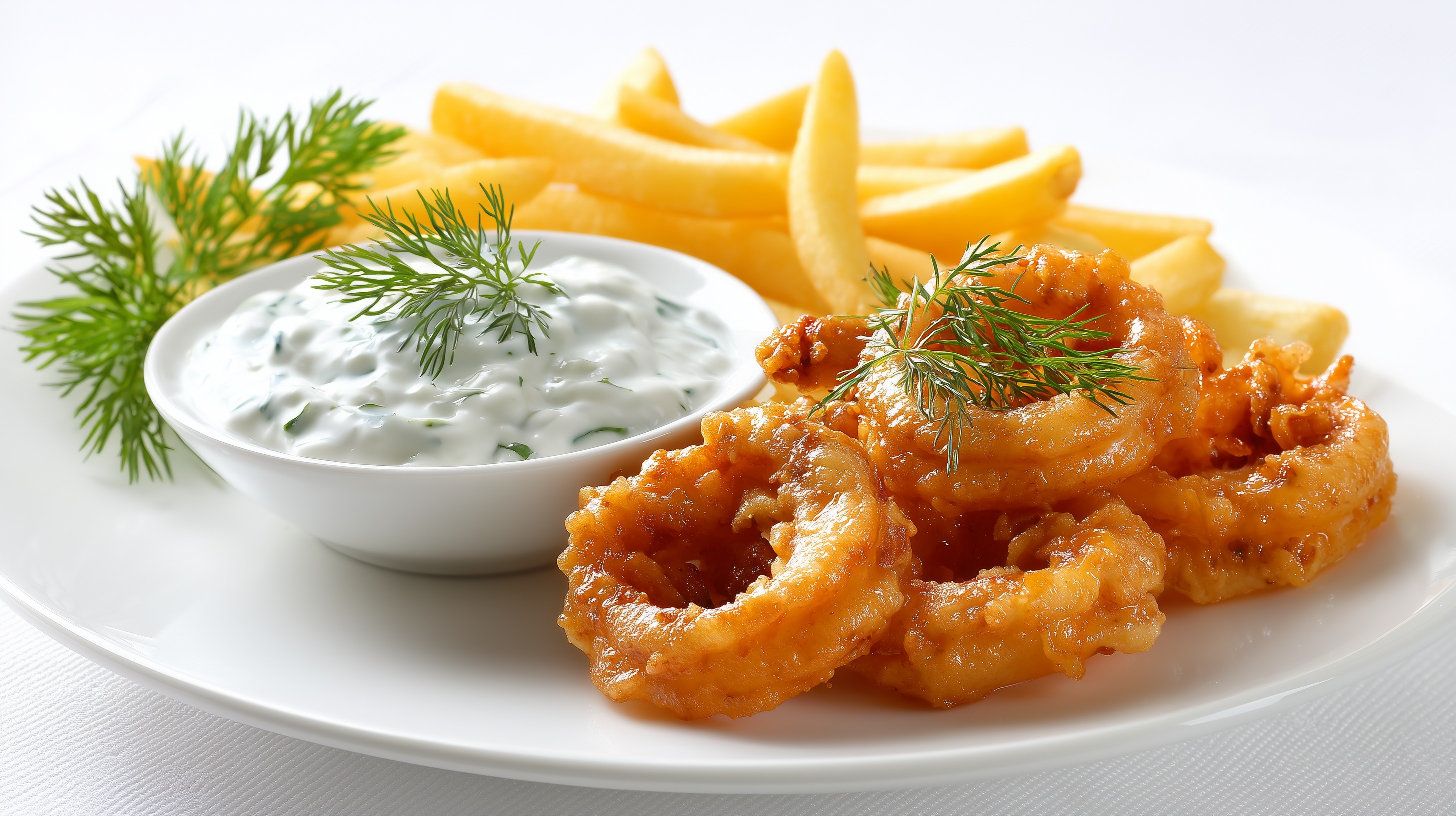 - Anrichten: Calamari, Pommes und Knoblauchcreme auf Tellern anrichten. Mit frischem Dill garnieren und sofort servieren.