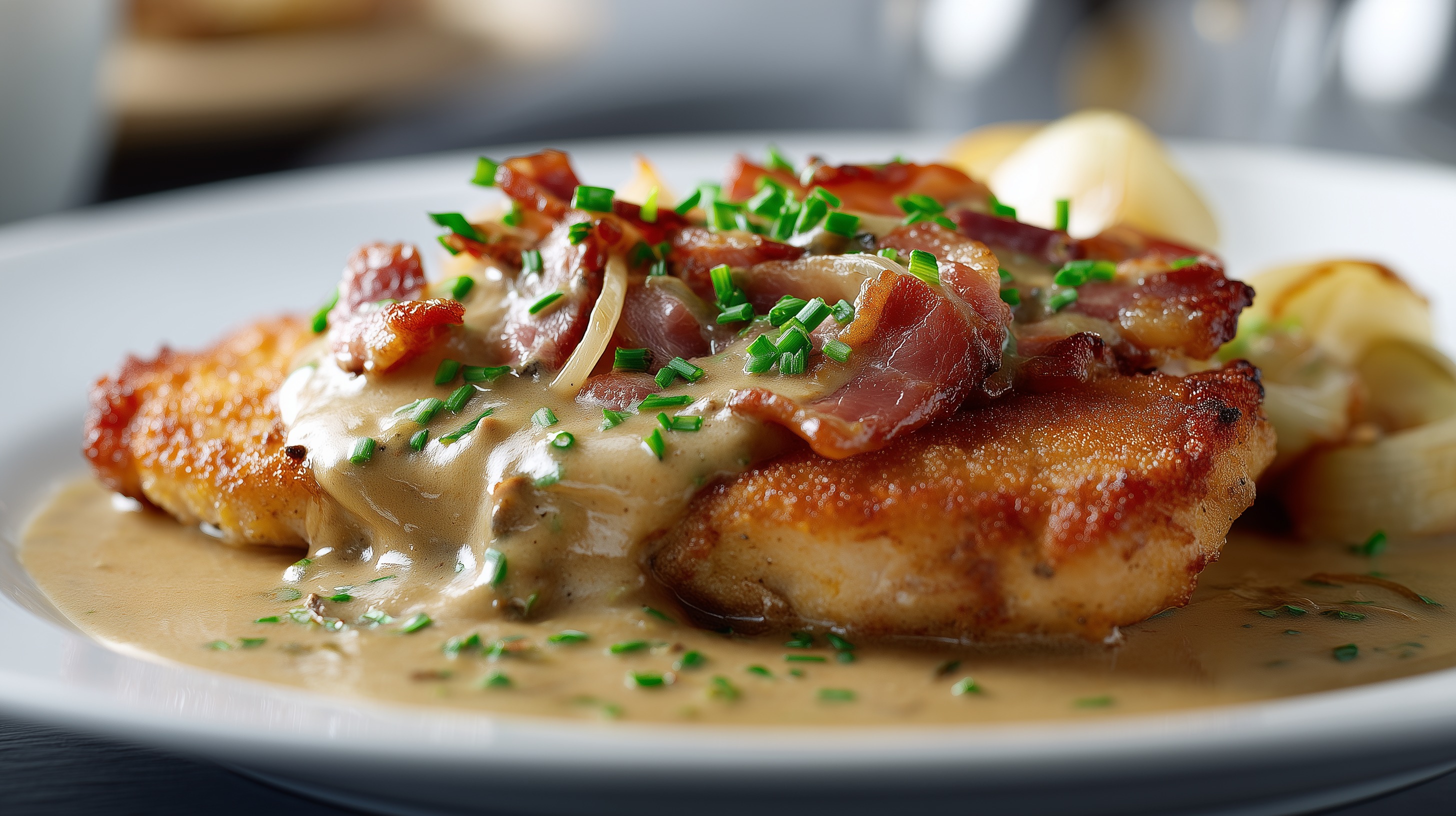- Die Schnitzel zurück in die Pfanne geben, den knusprigen Speck darüber verteilen und alles nochmals kurz 1–2 Minuten in der Sauce erwärmen.
