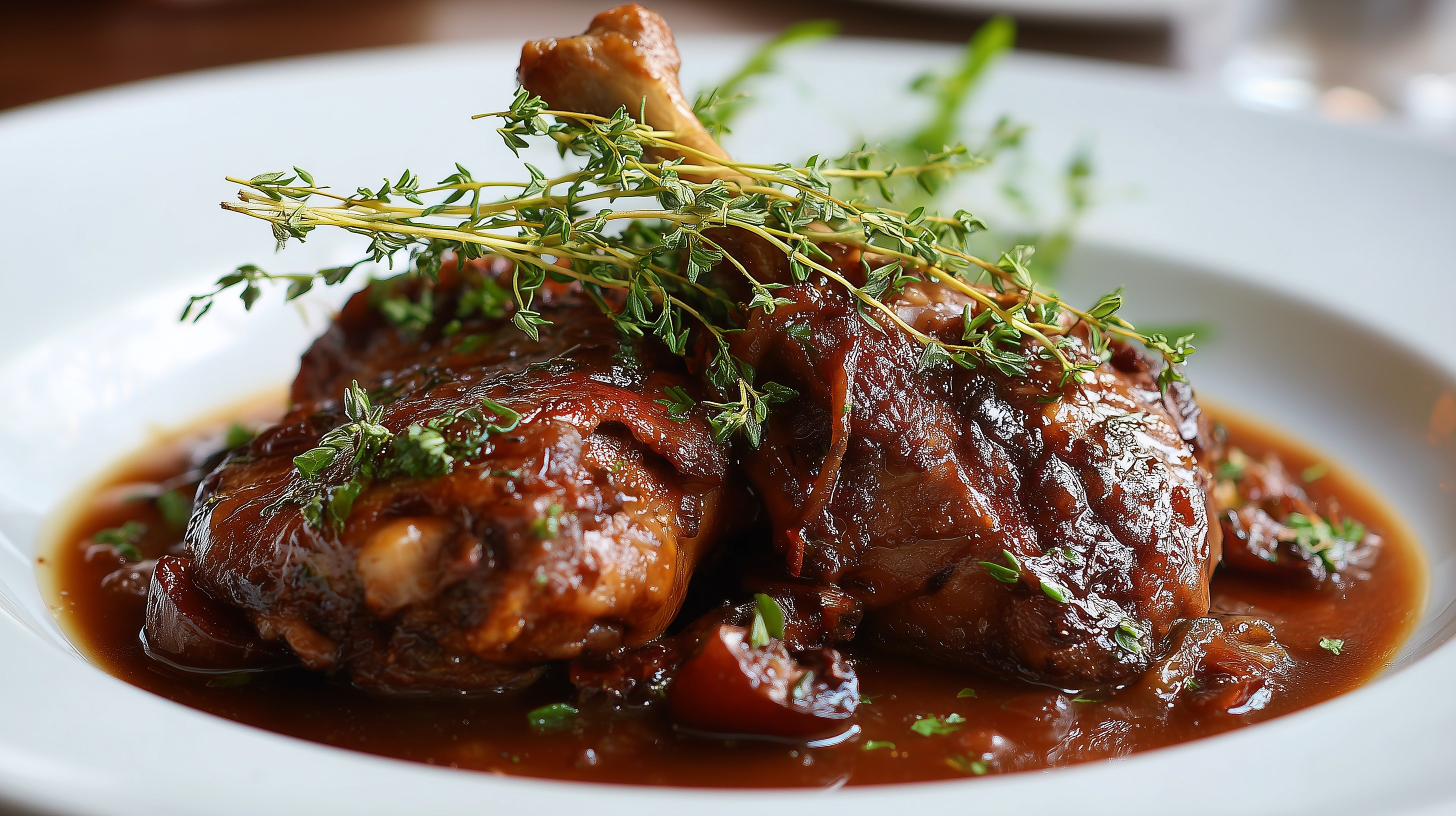 - Den Deckel auflegen und bei niedriger Hitze ca. 1,5 Stunden sanft schmoren lassen, bis das Fleisch sehr zart ist und sich leicht vom Knochen löst. Gelegentlich wenden.