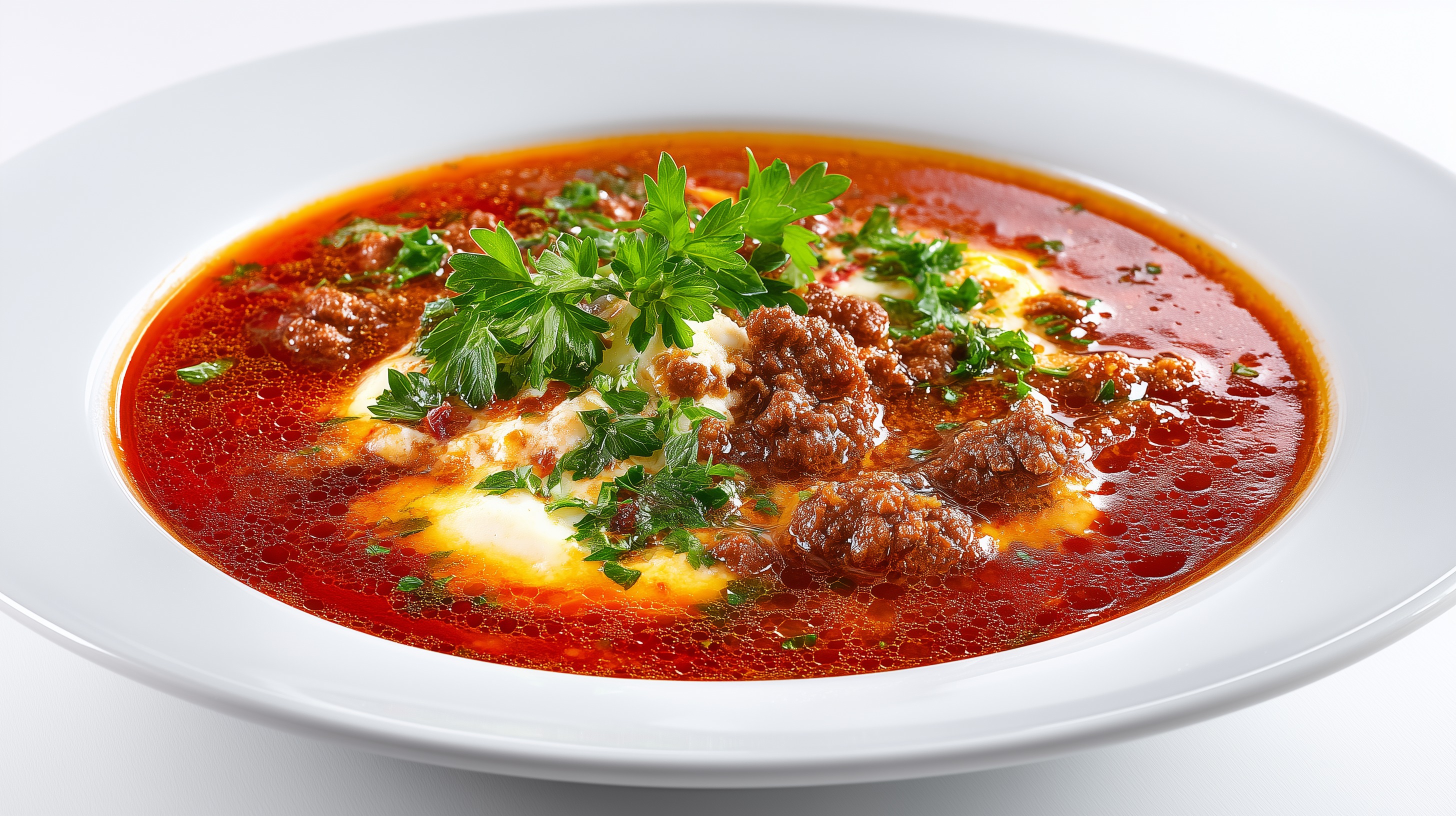 - Die Suppe in vorgewärmte tiefe Teller füllen, je einen großzügigen Klecks Sauerrahm in die Mitte geben und mit frischer Petersilie garnieren. Sofort servieren.