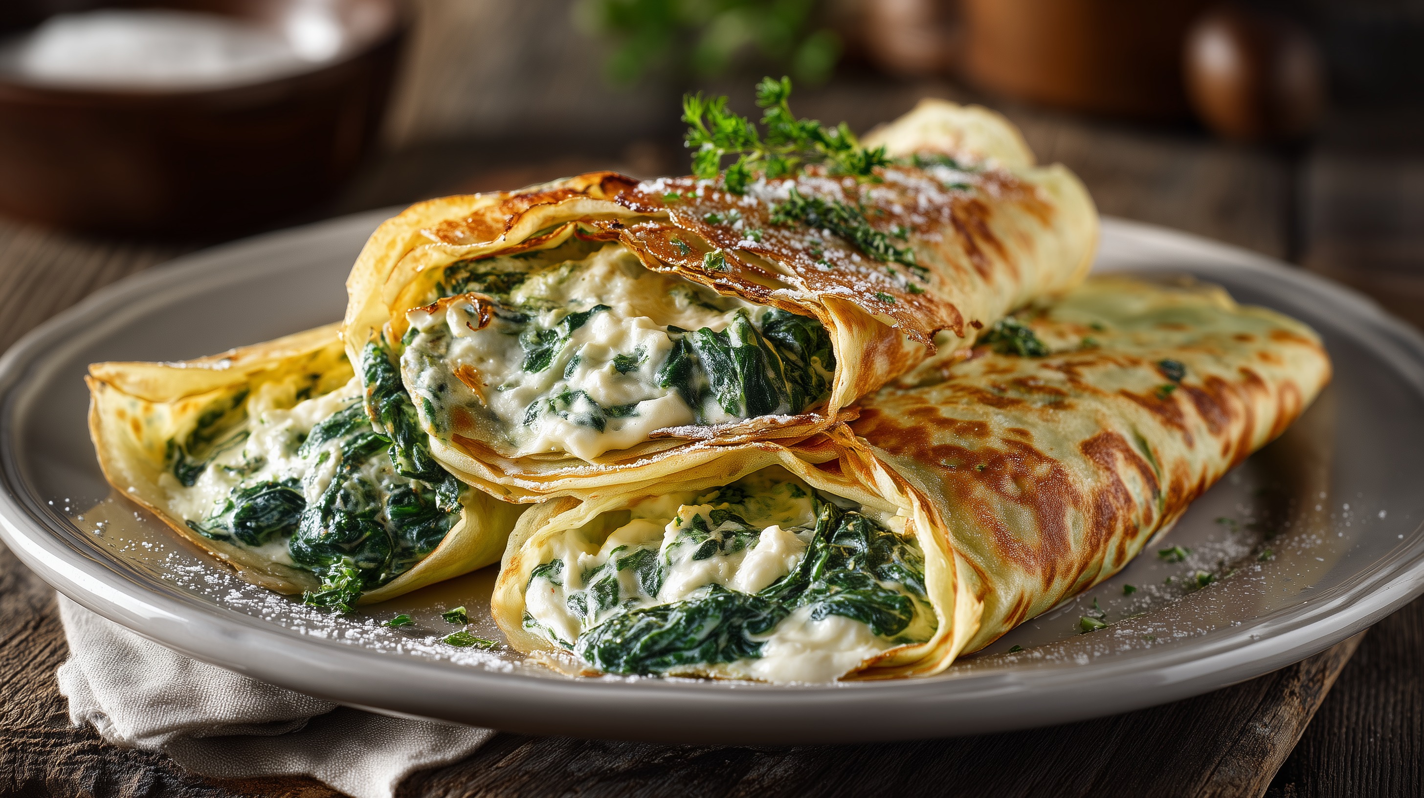 - Crêpes füllen und rollen: Jeden Crêpe auf einer Arbeitsfläche ausbreiten, einen großzügigen Löffel Spinat-Ricotta-Füllung in die Mitte geben und den Crêpe zu einer Rolle oder einem Päckchen formen. Je 2 Crêpes pro Portion auf einen Teller legen.