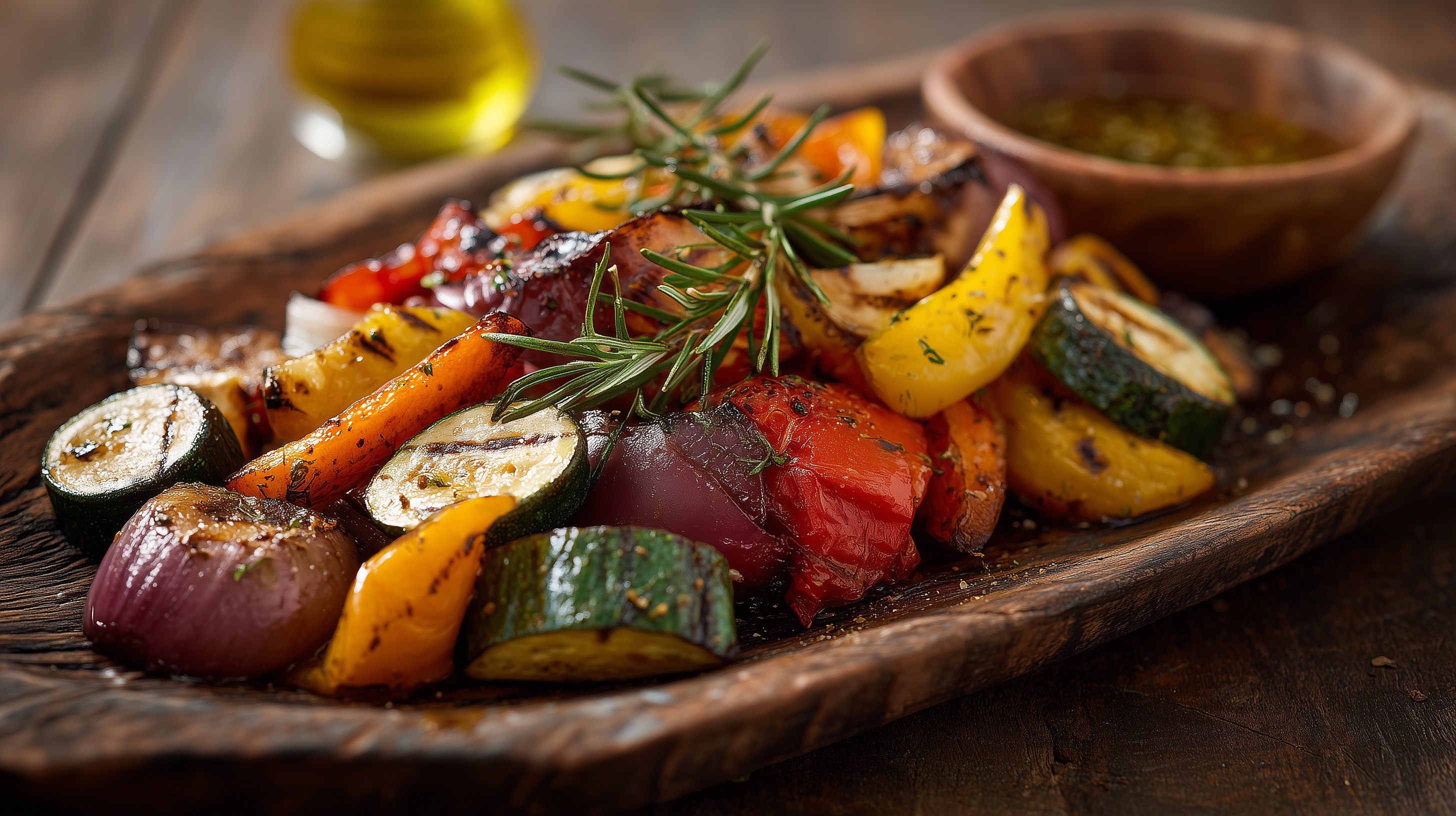 - Das fertige Gemüse aus dem Ofen nehmen, auf einem rustikalen Holztablett oder einer großen Servierplatte anrichten, mit den Rosmarinzweigen dekorieren und nach Belieben mit frischen Basilikumblättern garnieren. Sofort servieren.