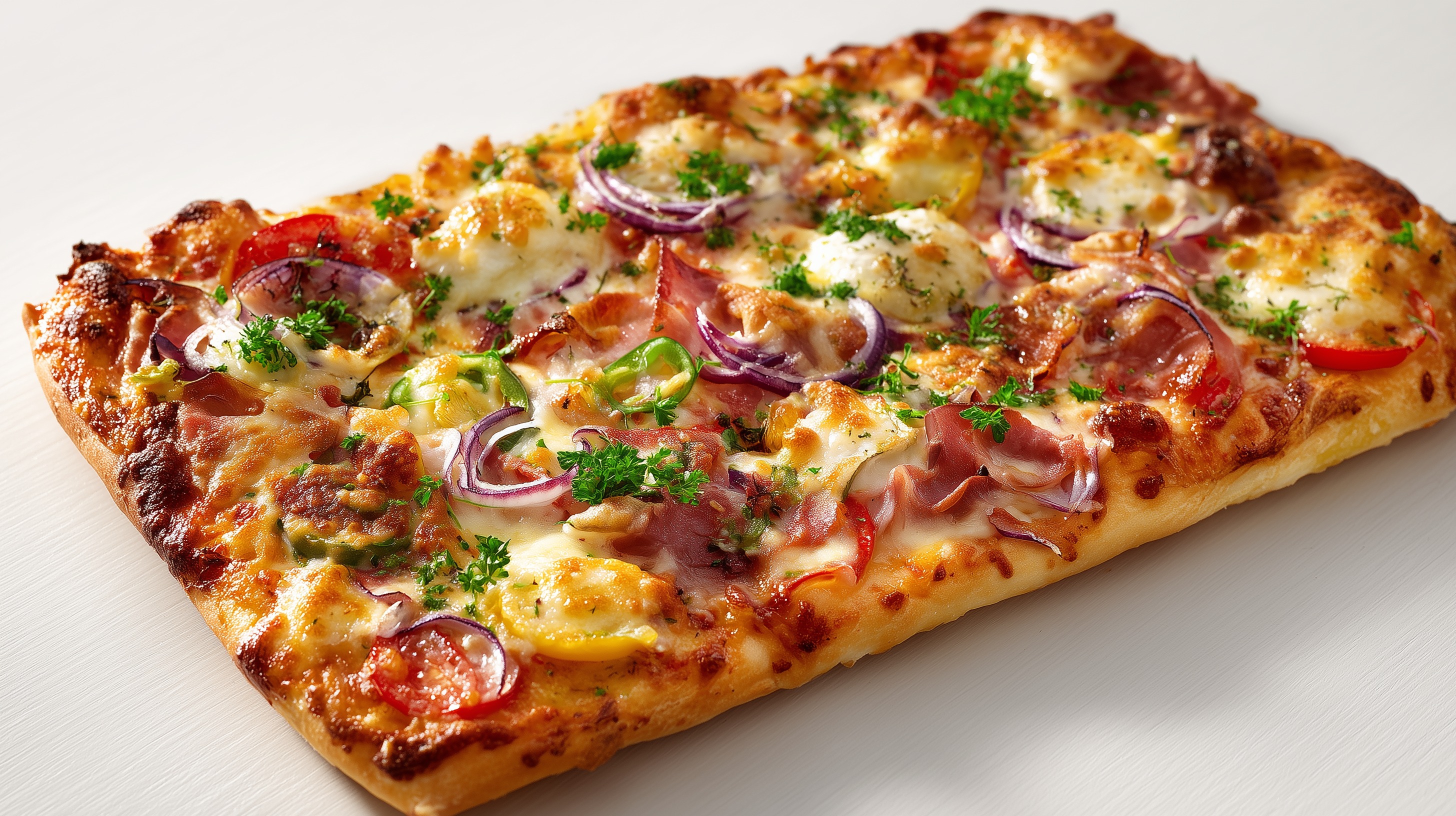 - Die Pizza aus dem Ofen nehmen, mit frisch gehackter Petersilie bestreuen und in 4 Portionen schneiden. Sofort servieren.