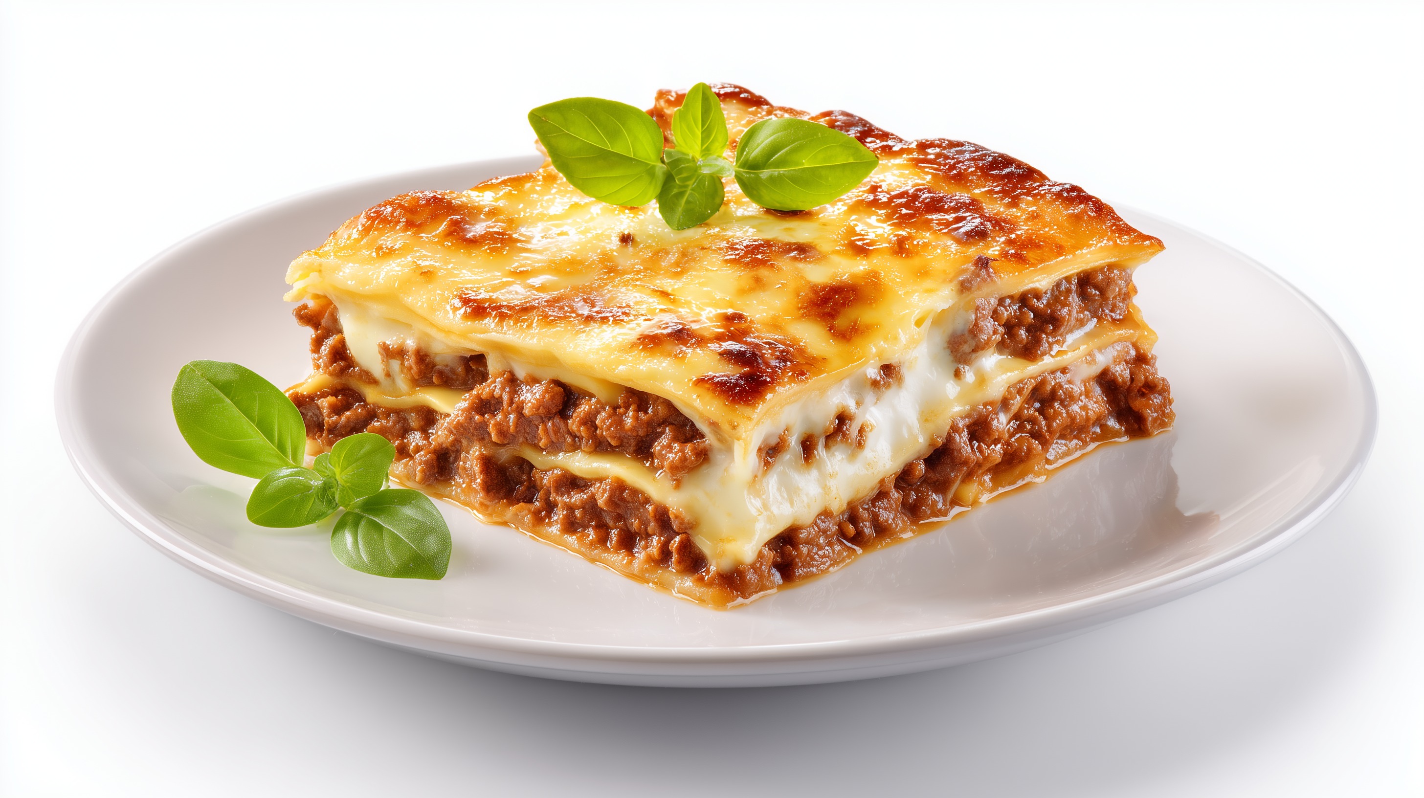 - Lasagne aus dem Ofen nehmen und 10 Minuten ruhen lassen, damit sie sich besser schneiden lässt. Mit frischem Basilikum garnieren und auf weißen Tellern servieren.