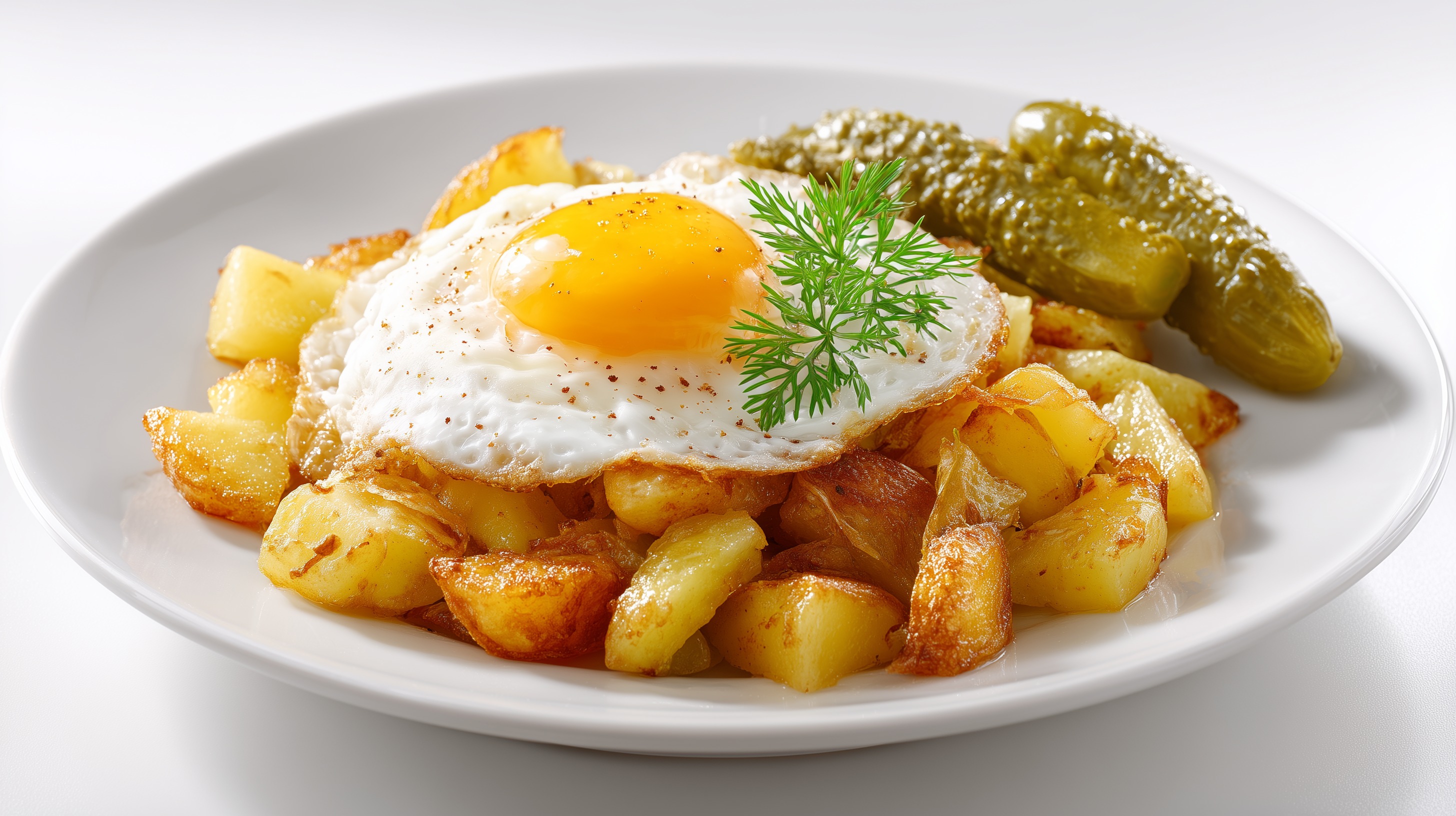 - Die Bratkartoffeln gleichmäßig auf vier vorgewärmte Teller verteilen. Jeweils ein Spiegelei obenauf setzen. Je zwei Gewürzgurken danebenlegen und mit einem Dillzweig garnieren. Sofort servieren.