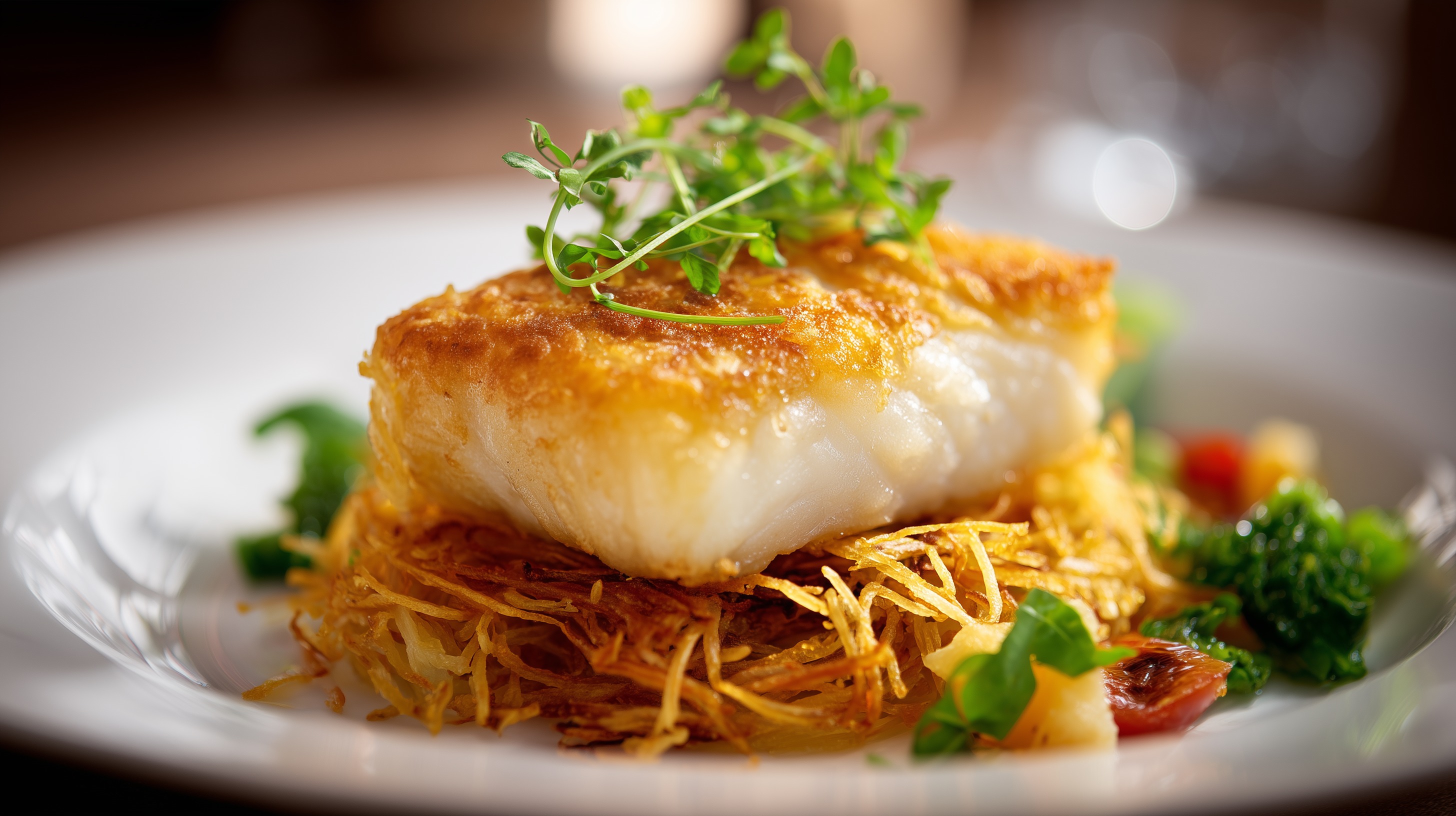 - Das Gemüse in der Mitte tiefer Teller anrichten, das knusprige Fischfilet daraufsetzen und mit frischem Thymian sowie Kresse garnieren. Sofort servieren.