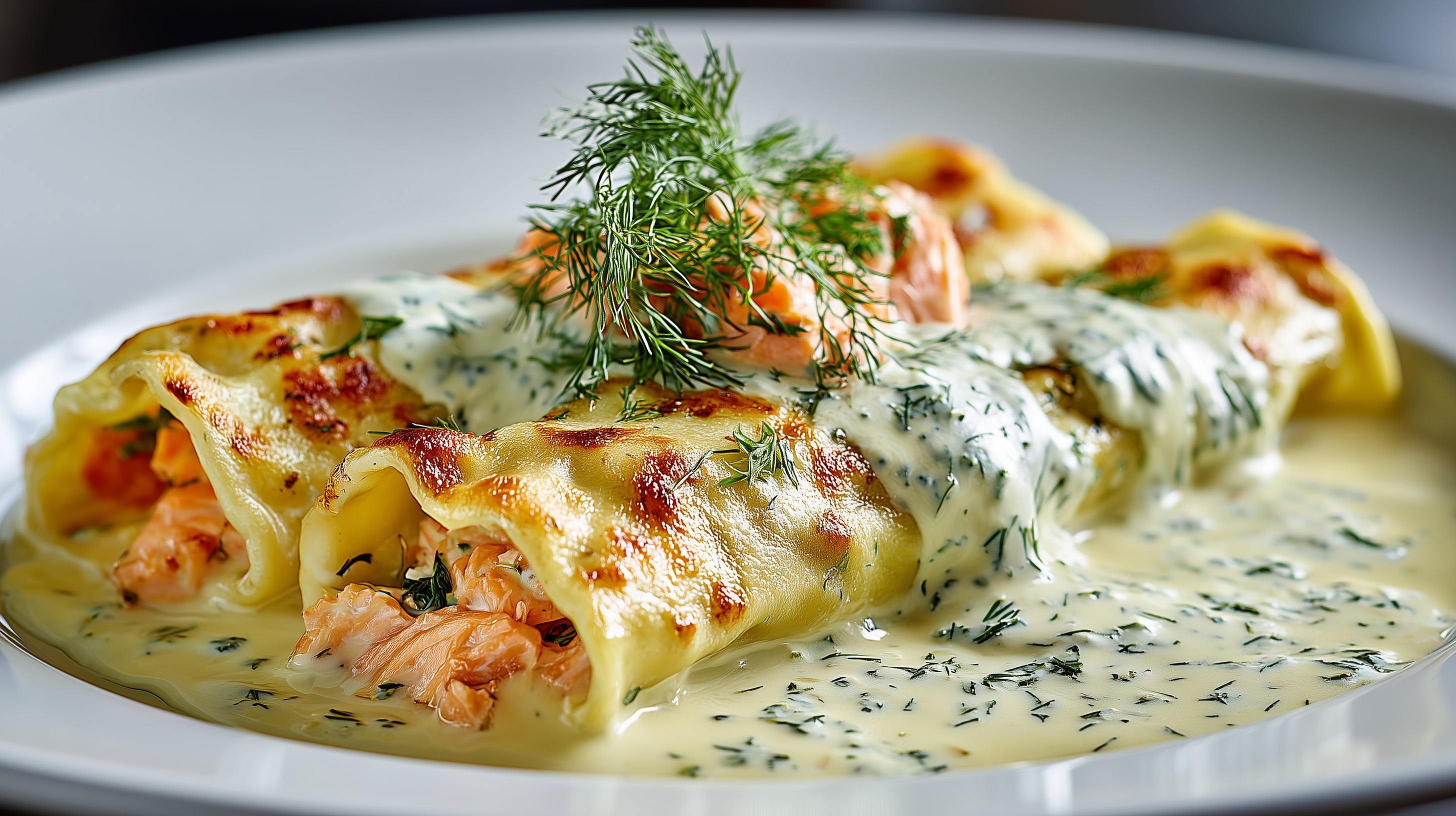 - Die Lachs-Cannelloni kurz ruhen lassen, auf vorgewärmten weißen Tellern anrichten und mit frischen Dillzweigen dekorieren. Sofort servieren.