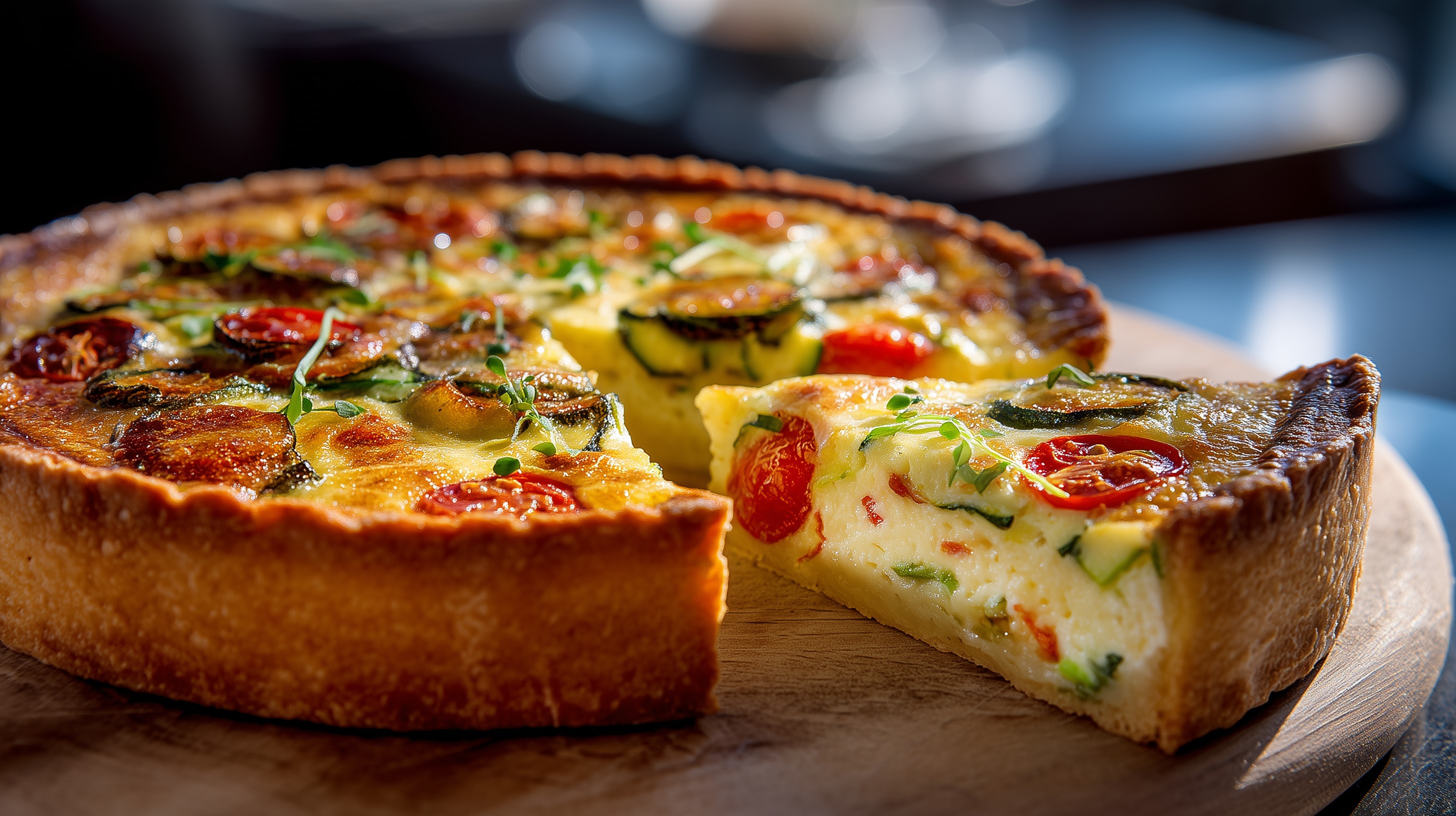 - Die Quiche im vorgeheizten Ofen ca. 35–40 Minuten backen, bis die Füllung gestockt und die Oberfläche goldbraun ist. Mit einem Messer in die Mitte stechen – wenn kein flüssiger Teig hängen bleibt, ist die Quiche gar.