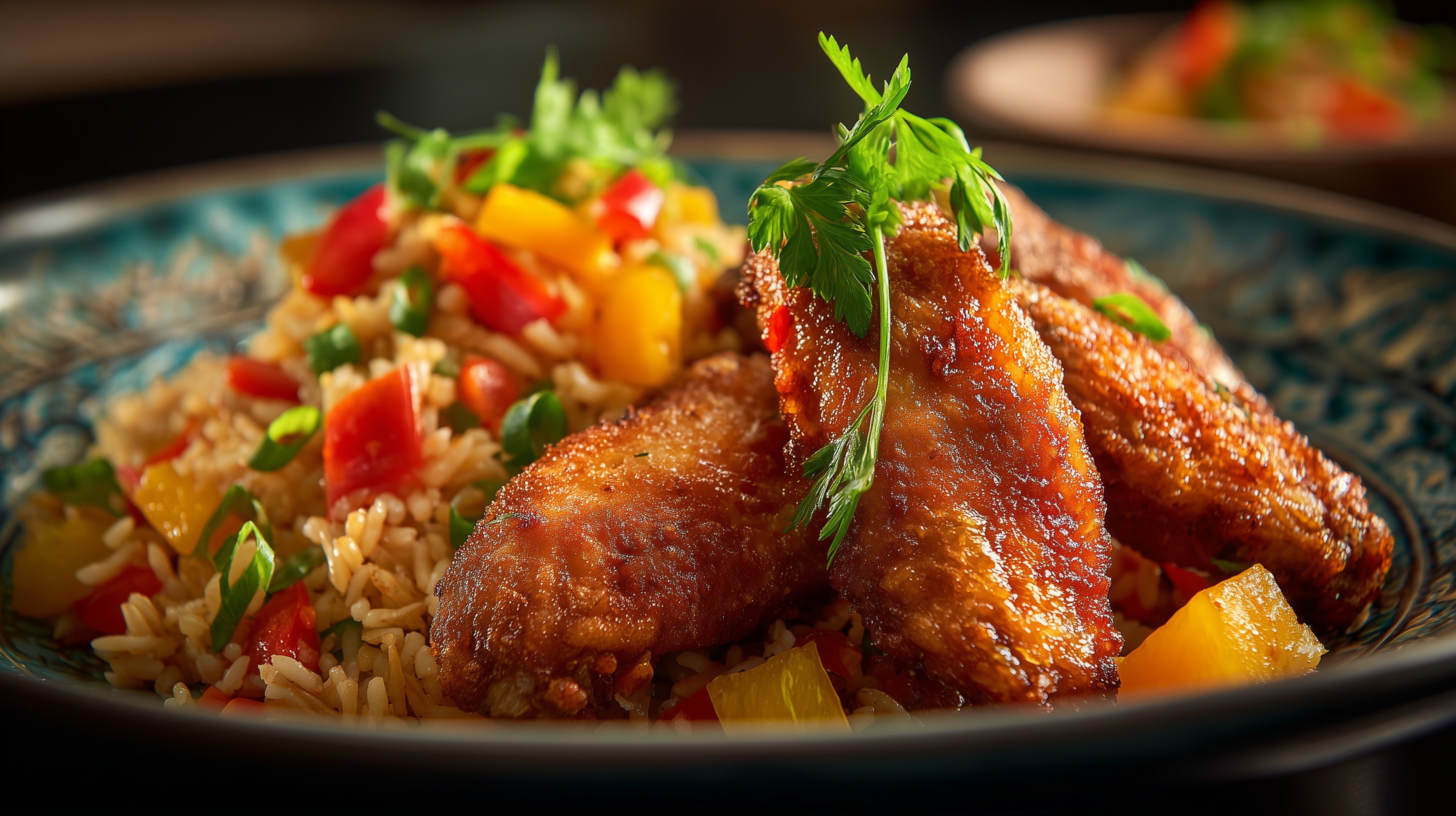 - Den Curryreis auf vier Teller verteilen, die knusprigen Hähnchenflügel darauflegen und mit frischer Petersilie garnieren. Sofort servieren.